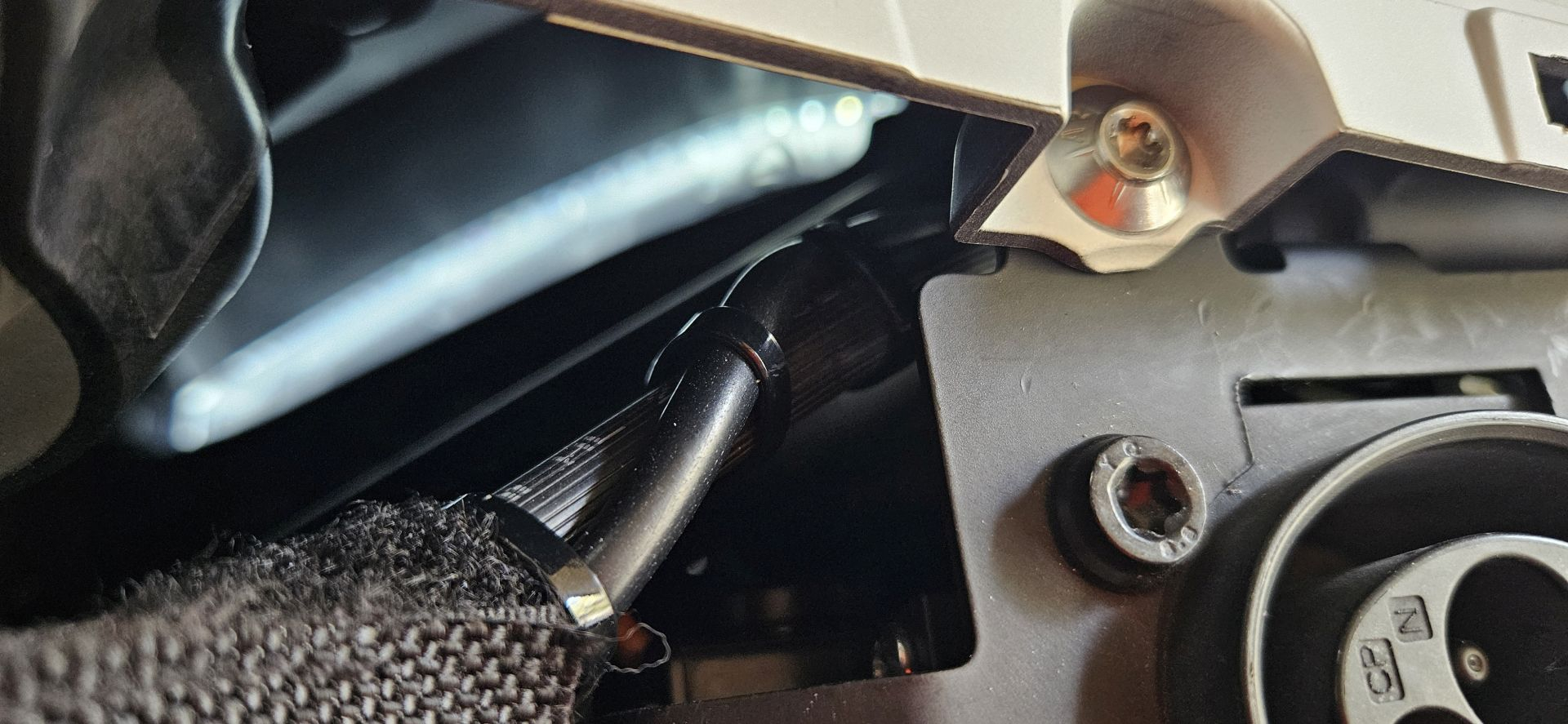 Darunter ist rechts unten ein schwarzes Zahnrad welches man händisch drehen kann und somit die Steckerarretierung löst.