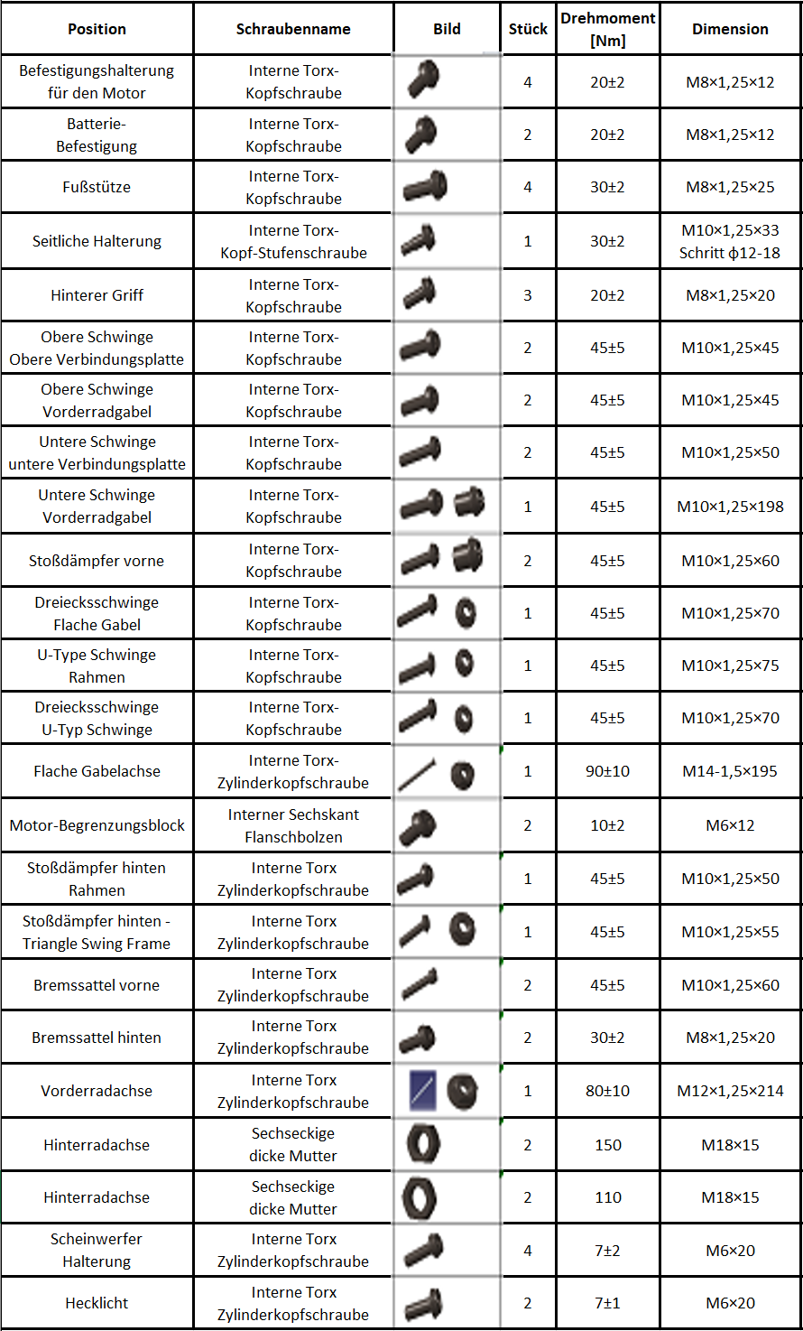 Zur Info. Hier sind die Angaben zu den Drehmomenten aller Schrauben:
