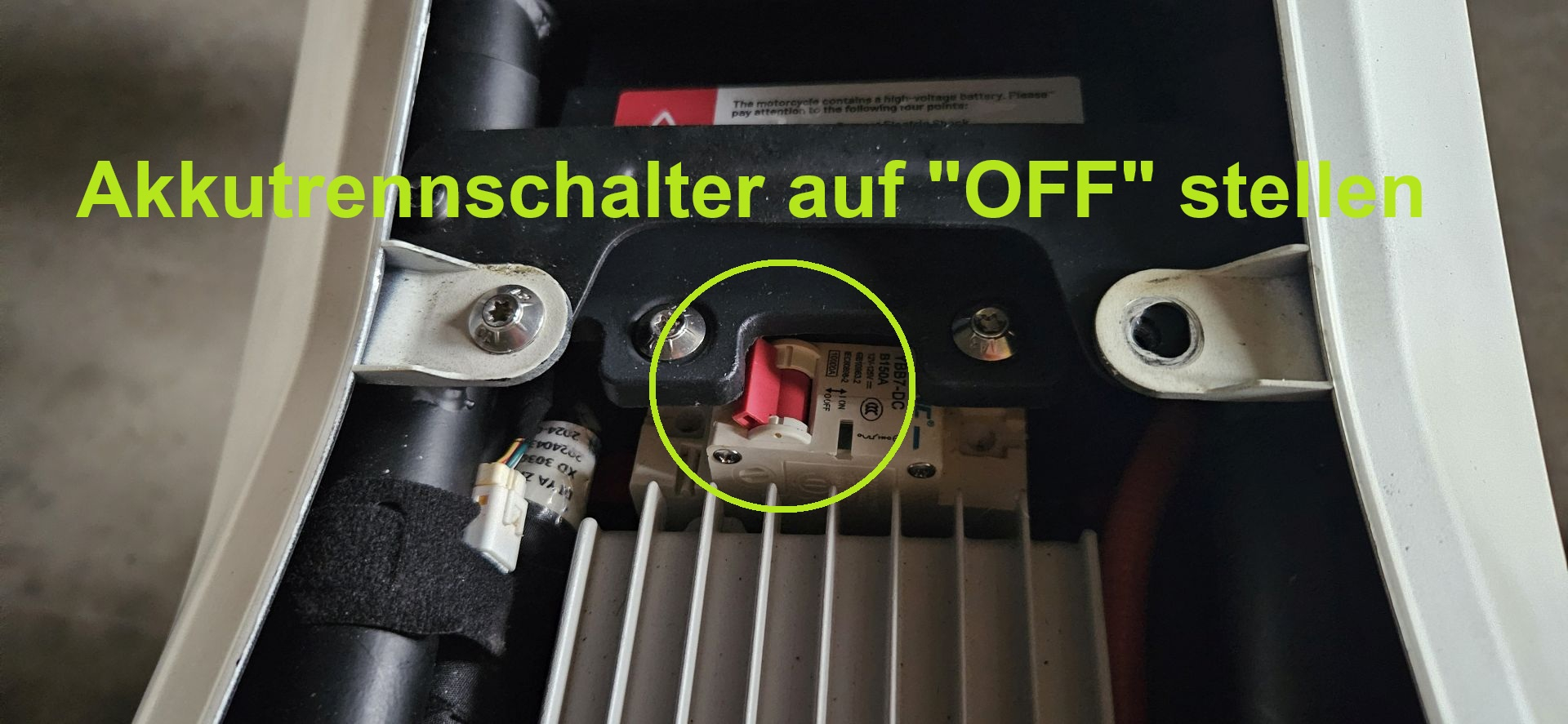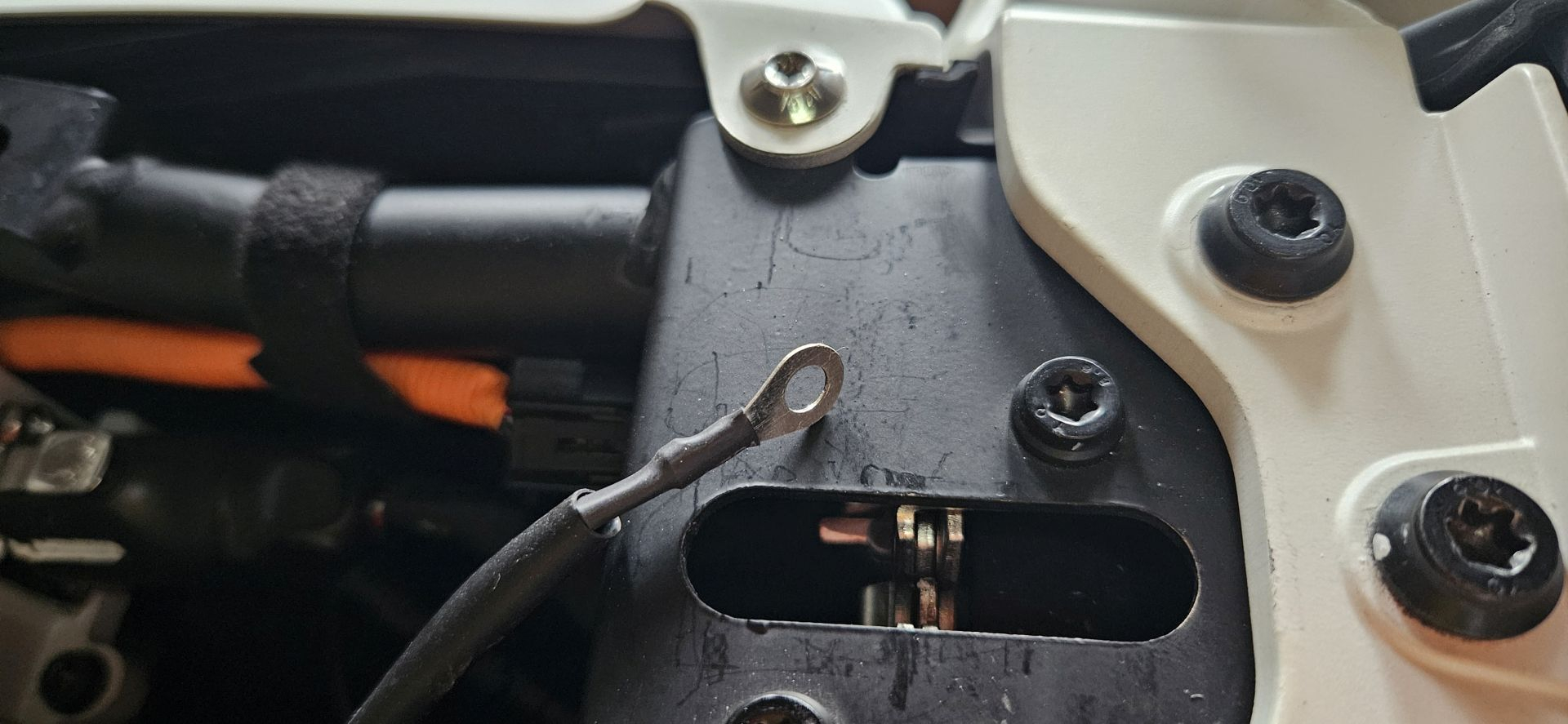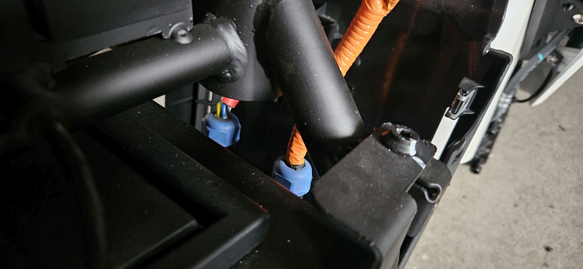 Leider habe ich bei genauem Hinschauen keinen Stecker gesehen mit dem man einfach die Stromverbindung zum Radnabenmotor lösen kann. Die orangenen Kabel laufe bei meiner Pro in Richtung der Unterseite eines alufarbenen Gehäuses. Wie man die Kabel vom Strom trennt und das Hinterrad ausbauen kann prüfe ich wenn die Vorderradfelge fertig lackiert, der Reifen aufgezogen ist und ich das Vorderrad wieder montiert habe.