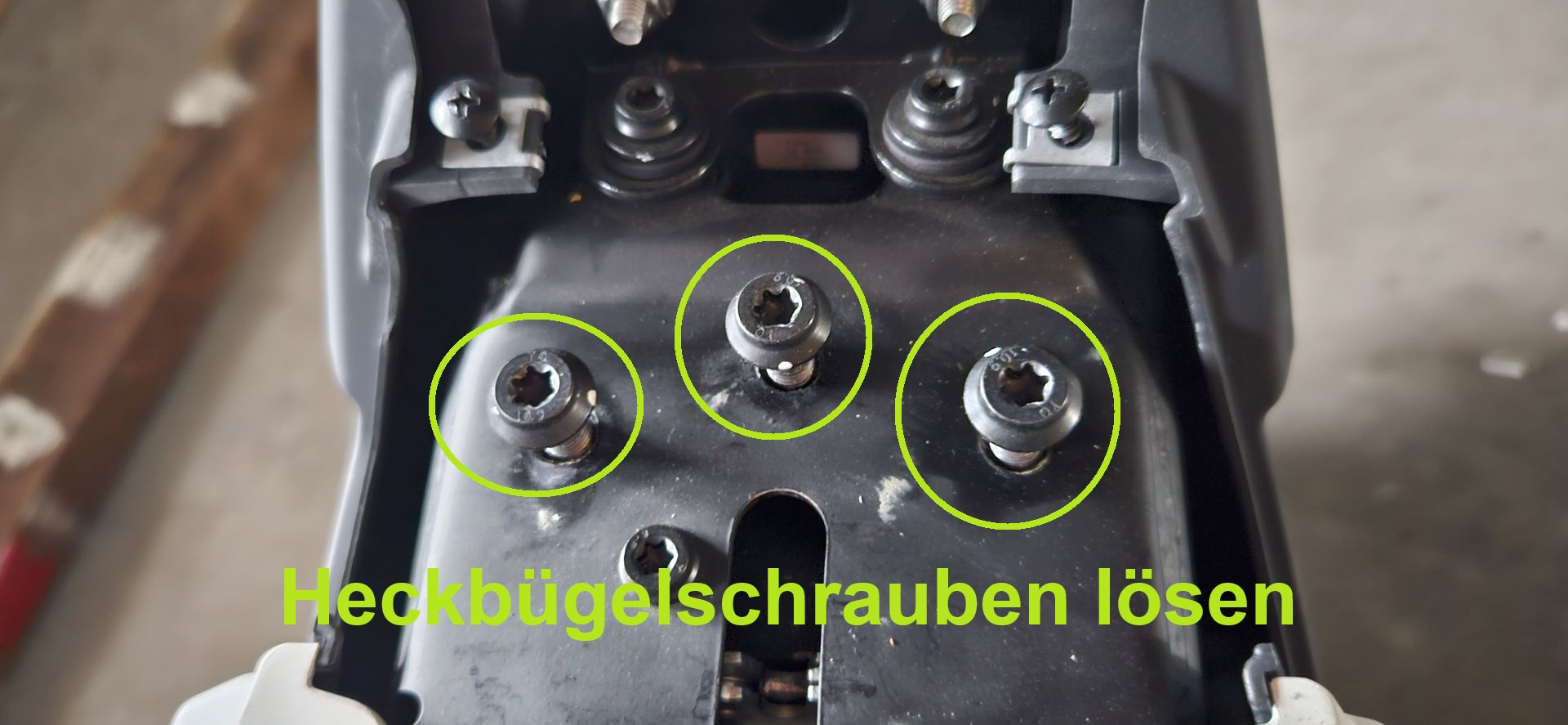 3) nachdem ich die Sitzbank abgestöpselte hatte entfernte ich die entriegelte Tankdeckeleinheit (2 silberne TX Schrauben). Danach löste ich 3 schwarze große Schrauben für den hinteren Metallbügel (der mit den 4 Gewinden, von unten geschnitten). Die großen Plastikseitenteile sind mit den silberfarbenen TX Schrauben (die mit der integrierten Scheibe), 1 schwarzen Plastikstöpsel vorne und 2 schwarzen Kreuzschlitzschrauben (wenn ich mich recht entsinne) am Rahmen befestigt.