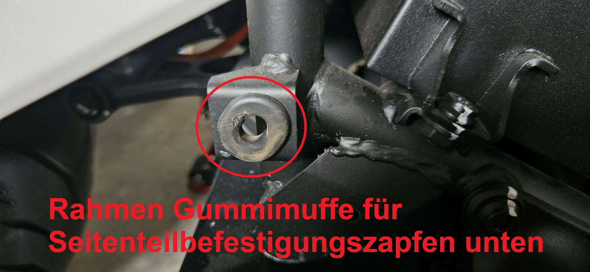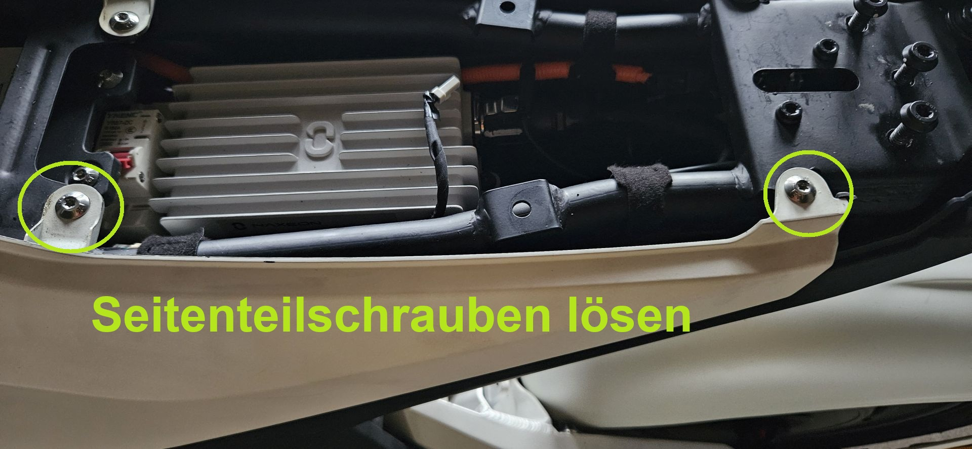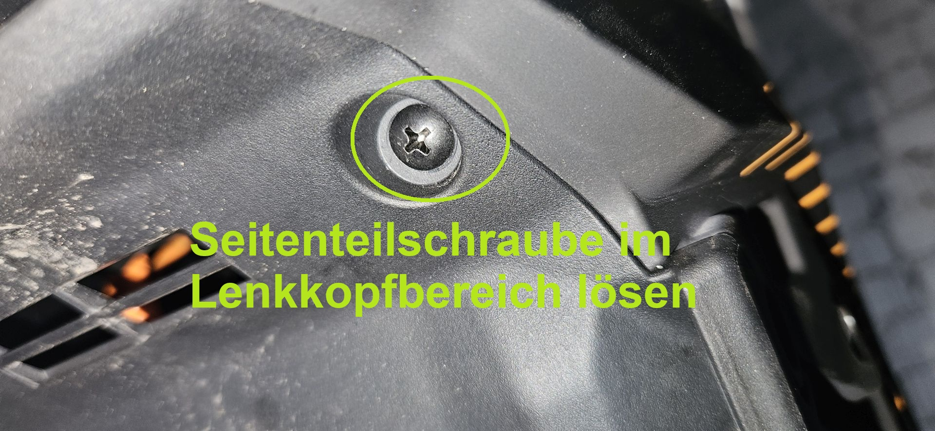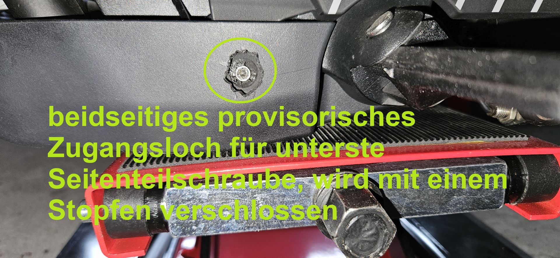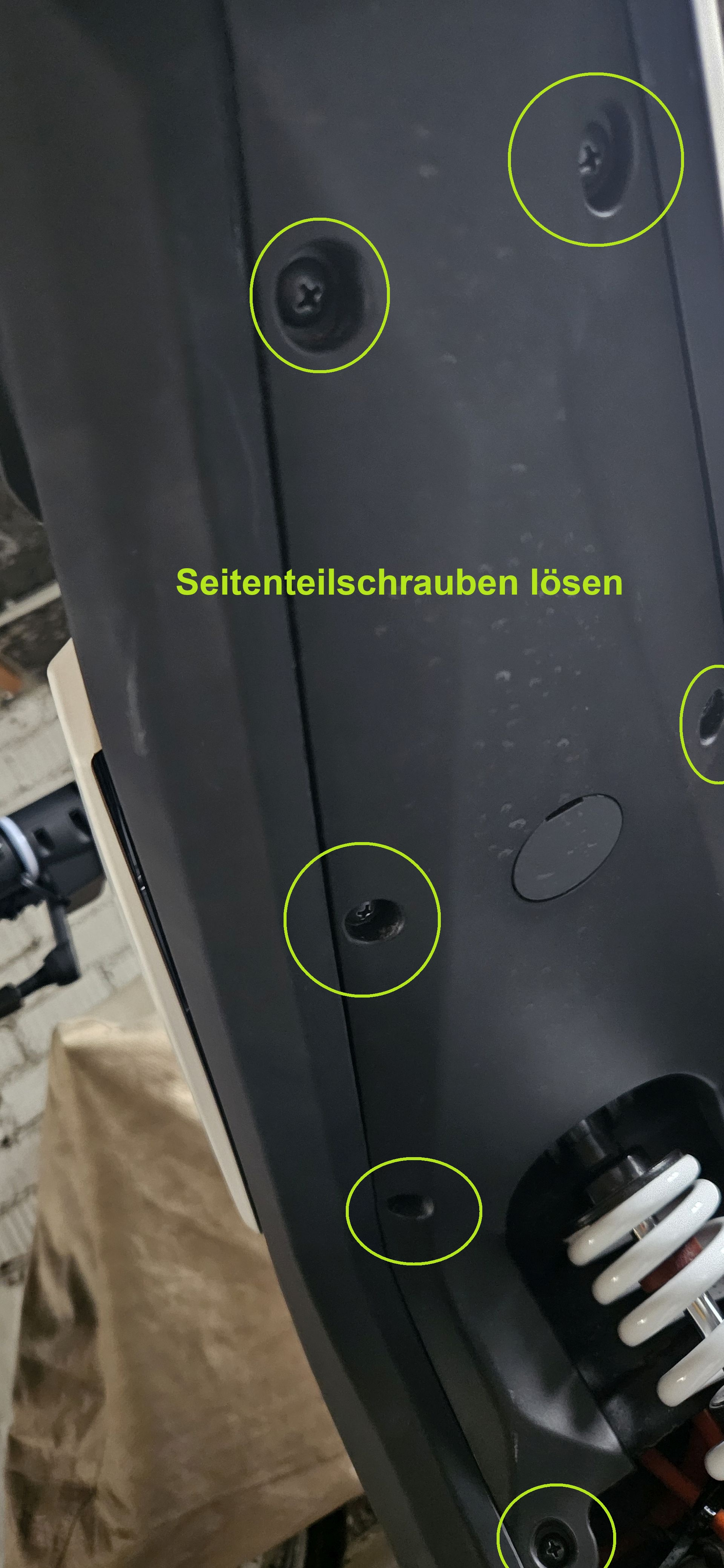 ACHTUNG: die versteckteste silberne TX Schraube verbirgt sich ganz unten hinter den Unterbodencover. Da ich meine Pro aufgebockt habe mußte ich mir R und L ein Loch schneiden um die Schrauben herausschrauben zu können.