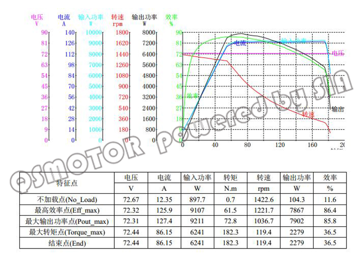 Je nach kV Zahl (Umdrehung pro Volt) könnte dein Motor eine Leerlaufdrehzahl von 1.422 1/min haben und nimmt dabei einen Leerlaufstrom von 12,3A auf = 104W, was etwas widersprüchlich ist, da 72V * 12,3A erheblich mehr ist.Bei 1.037 1/min hat der Motor seine höchste Leistung von 7,9kW und nimmt dabei 9,2kW auf, was bei 72V einem Strom von 127A entspricht. Immerhin ergibt es einen Wirkungsgrad von 85,8%.