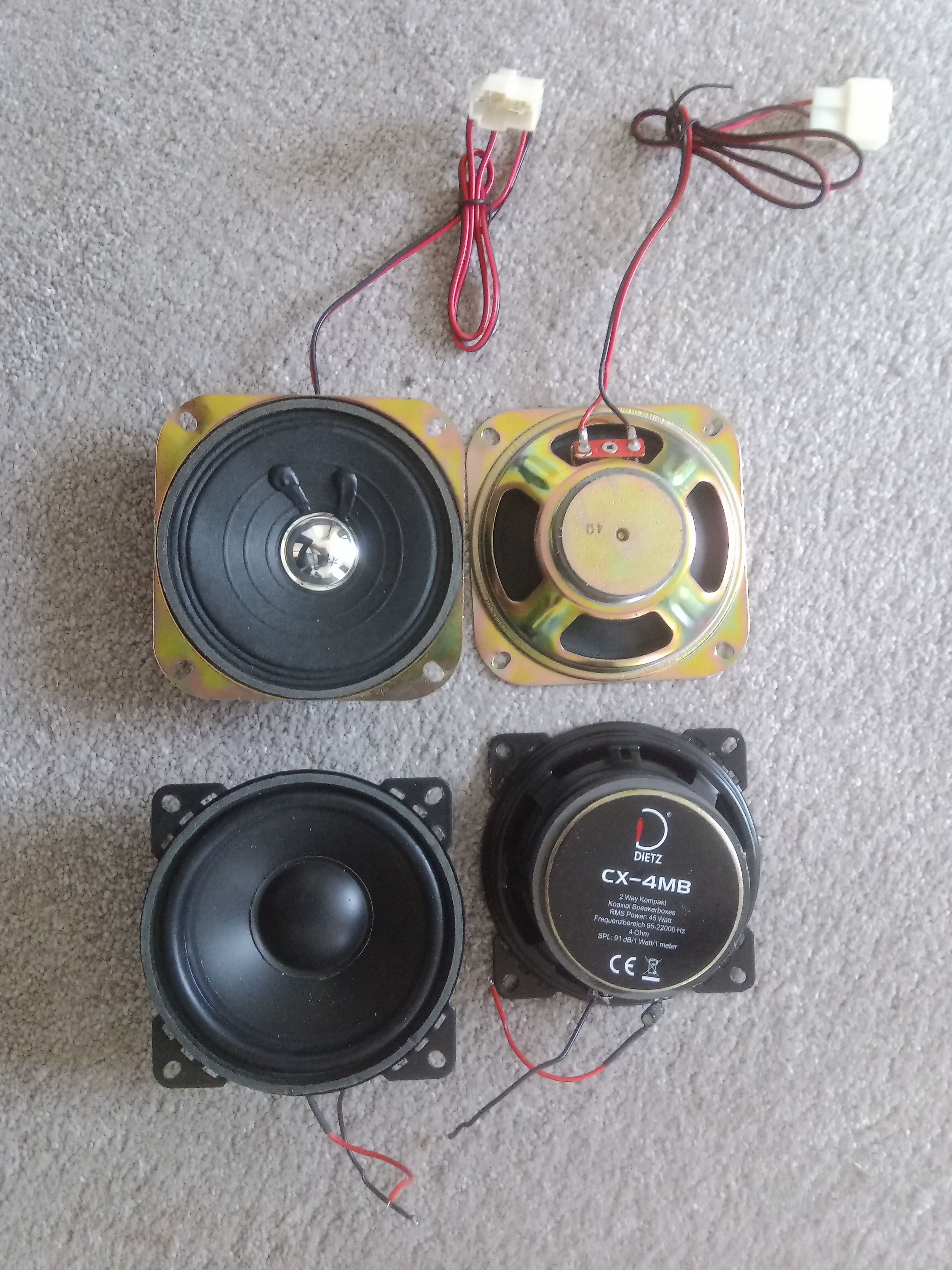 Den Unterschied sieht man schon von Original und Tuning.Der Klang ist schon mit dem fahrzeugeigenen Radio deutlich besser.Ein Anflug von Bass ist sogar zu hören und leicht zu spüren.Die Kabel sind ja ruckzuck umgelötet.Wer das macht sollte auf eine möglichst hohe dB Zahl achten.91 dB oder mehr bei 4 Ohm. 100mm Chassis mit 82mm Lochabstand passt ganz genau. Mit einem "richtigen" Radio wird es natürlich bombastisch.Die DAB Antenne muß noch installiert werden,dann klappt's auch mit Radio Bob,-).Die Lautsprecherausgänge sind jetzt parallel zum Ori.-Radio geschaltet.So kann ich wahlweise eines benutzen.Die Kabel dafür sind im "Motorraum" leicht zu finden.Stromdiebe dran und fertig.Ich glaube aber nicht,das sich in dem kleinen Fahrerraum 4 Lautsprecher (Front/Heck) lohnen werden.Man könnte ja noch einen Subwoofer unterm Fahrersitz montieren -zwinker- und dort die gesparten 650W der Originalheizung hinleiten .