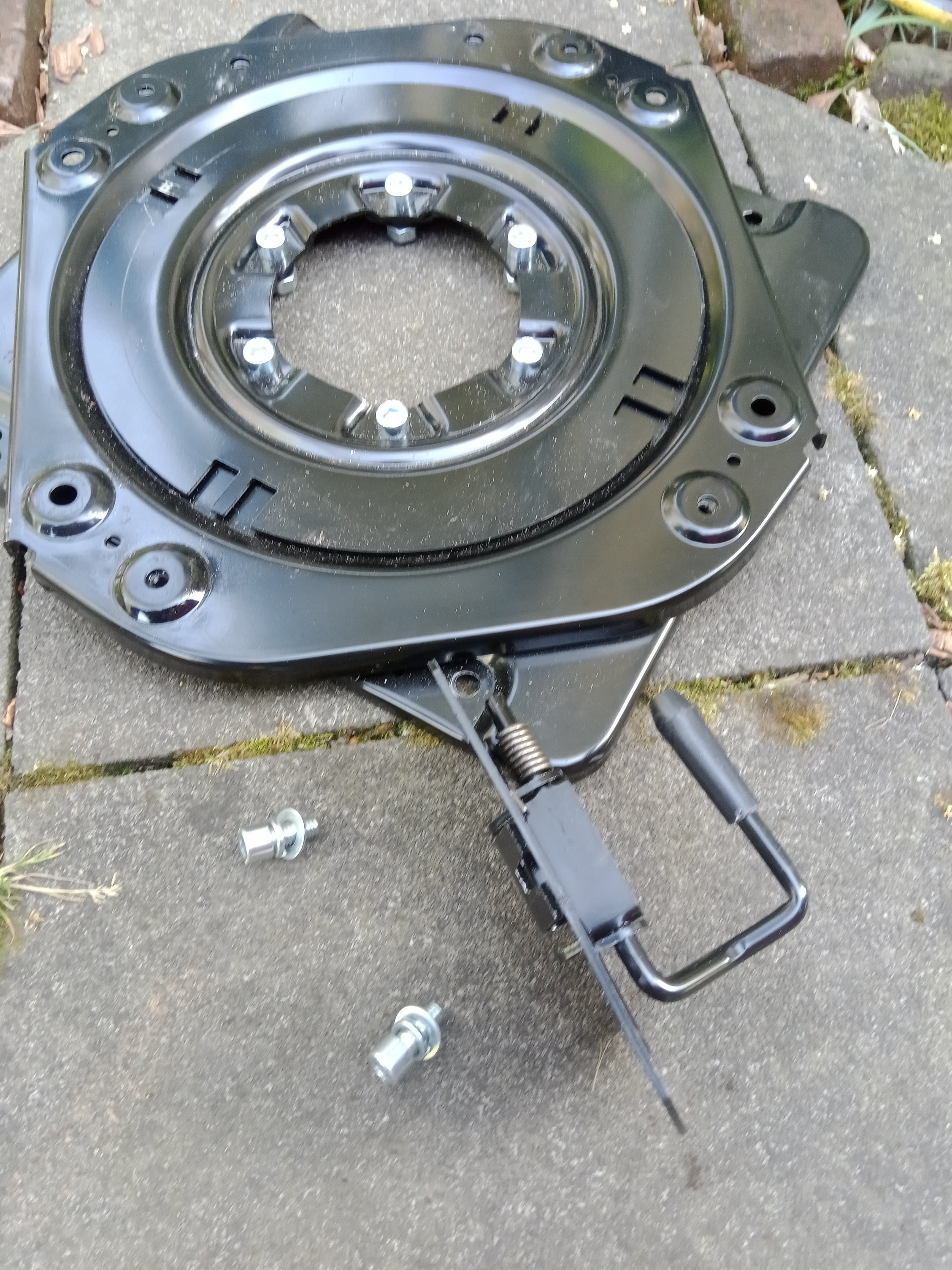 Man wird dieses Drehteil unterm Sitz abschrauben können,wenn man es etwas links/rechts dreht und durch die Löcher der Sitzbefestigung den Inbus ansetzt.Dabei zuerst die hinteren Schrauben ausdrehen.Aber leider dreht dieser Schemel nicht mehr,selbst wenn man die Hebelmechanik entfernt ....grrrr....warum ? Da is doch nüschts mehr,was blockieren könnte....hab es mit einem langen Hebel versucht zu drehen...mich dabei auch mal drauf gehockt...nüschts ,bombenfest !