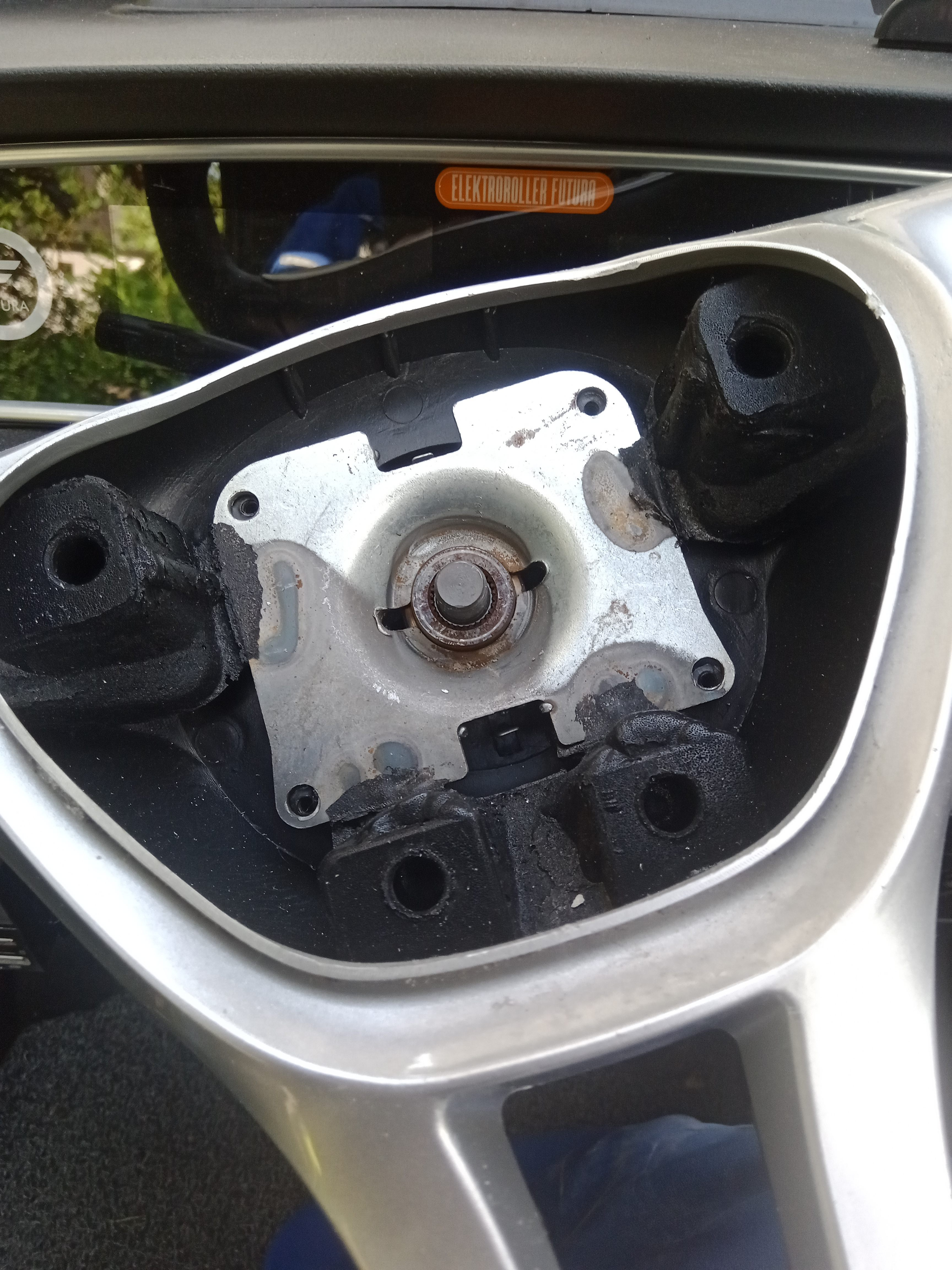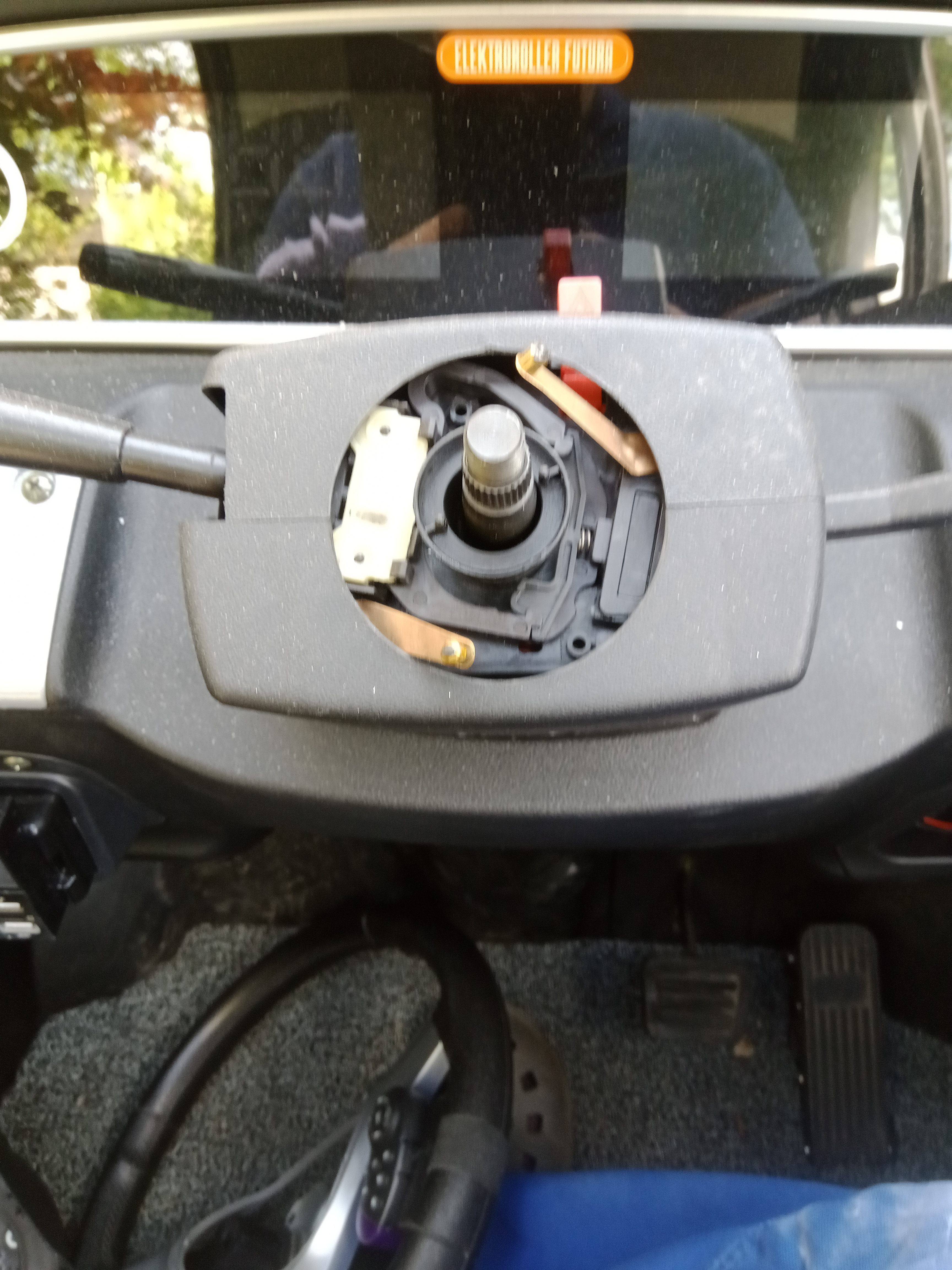 Am Lenkrad einfach die Hupenplatte durch ziehen abnehmen.Die Kontakte sind vorsintflutlich einfach gehalten.Die Metallplatte darunter muß nicht gelöst werden.Lenkrad festhalten und die Mutter abschrauben,dann läßt sich das Lenkrad abziehen und in der gewünschten Position wieder aufstecken. Anschließend die Mutter wieder gut festziehen. Da ich keine Einstellwerte habe,muß ich mit der finalen Spureinstellung noch ein klein wenig spielen.Das Ergebnis ist noch nicht 100%ig,was man auch an der leicht verringerten Endgeschwindigkeit merkt.