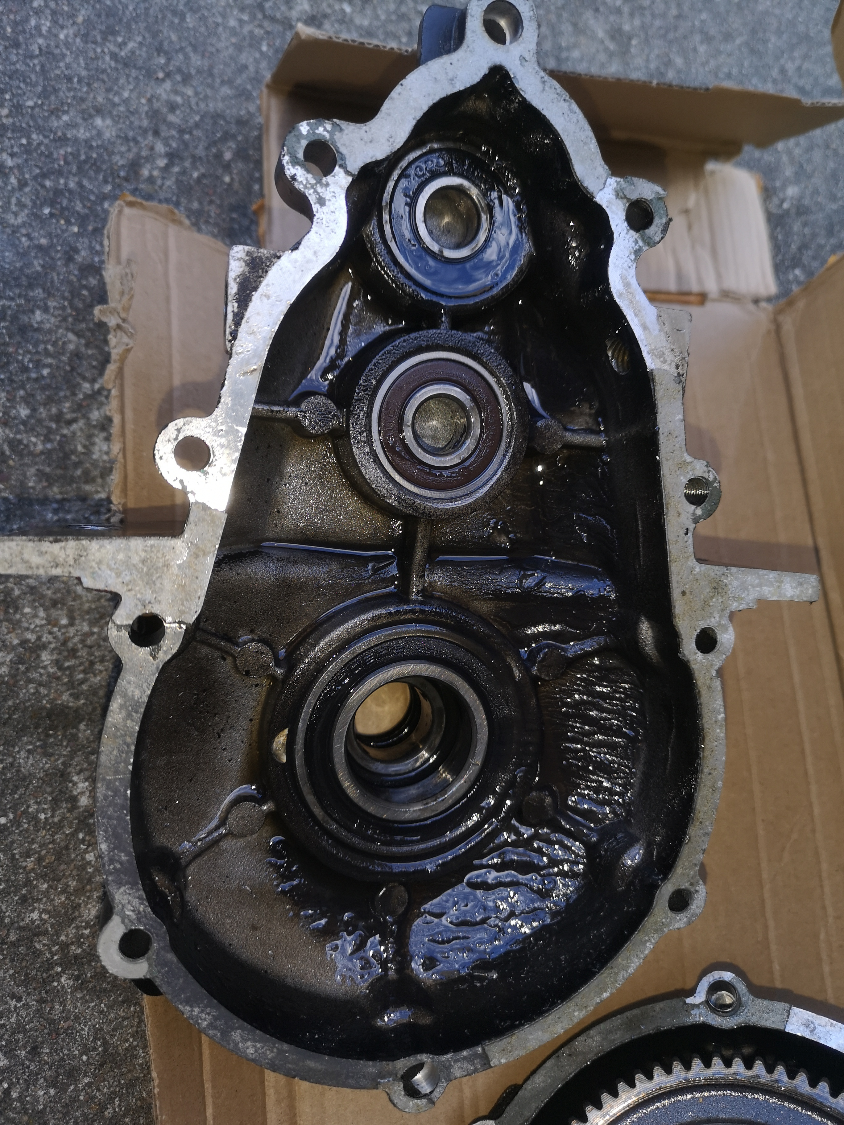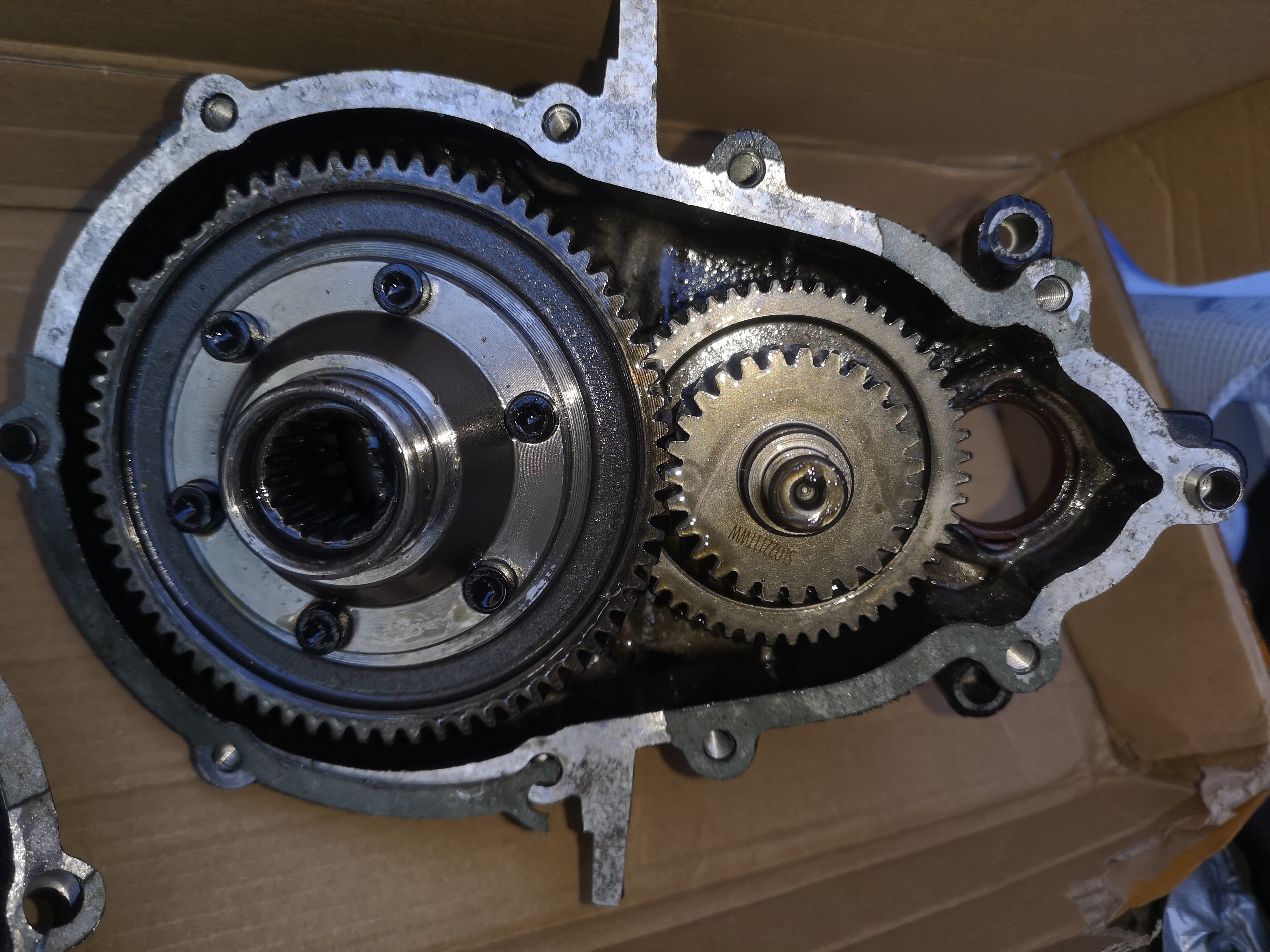Der Motor sitzt hinter der Achse und ist über ein Vorgelegegetriebe mit dem Differential verbunden. Diese Vorgelege hat eine Einfüllöffnung und eine Ablassschraube, aus der auch etwas Getriebeöl kleckerte. Am Differential gibt es keine Ablassschraube. Beim Öffnen des Gehäuses kam auch absolut kein Öl raus.