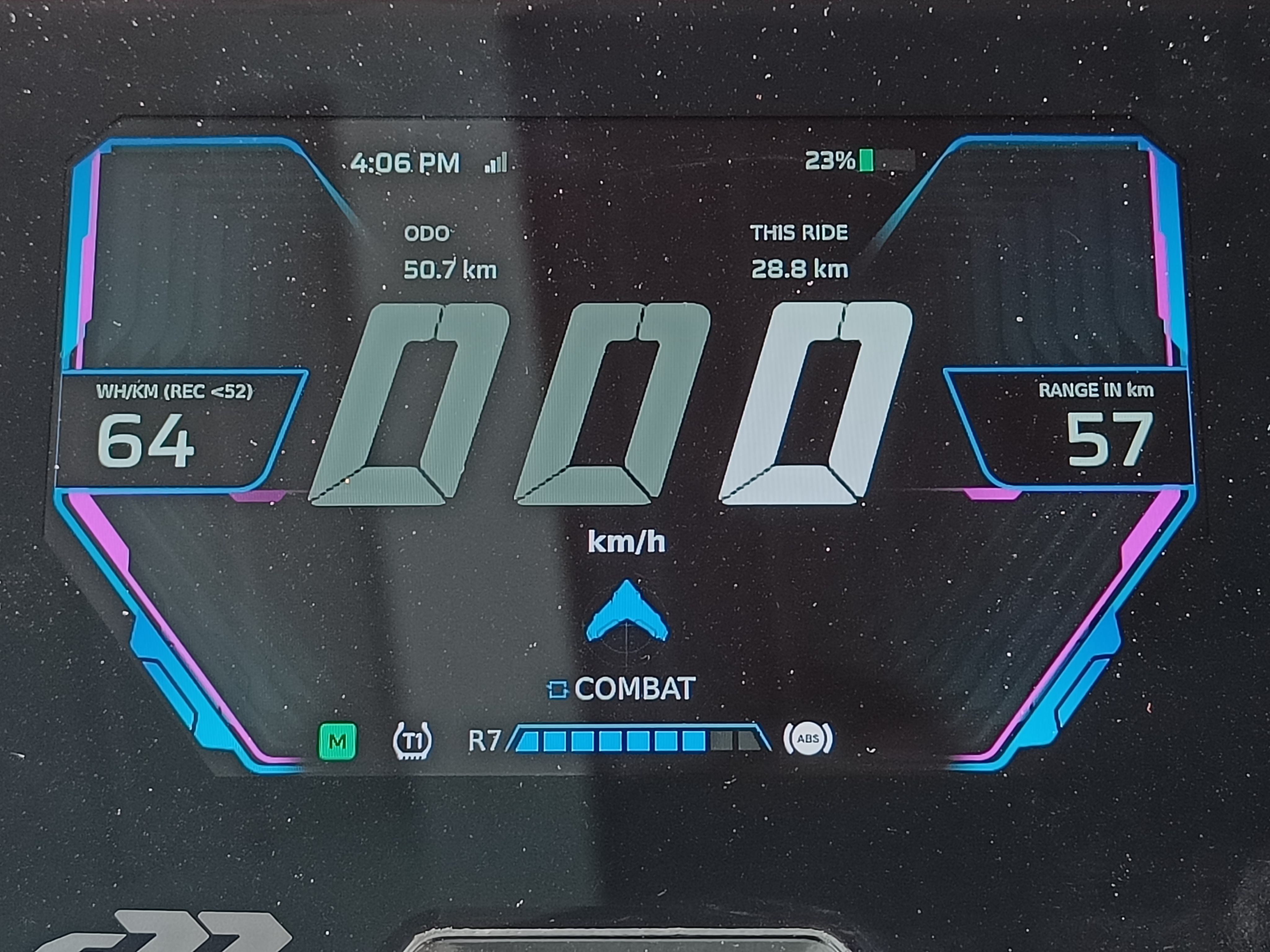 o Zum Verbrauch: Ich bin die ersten 50 Kilometer primär in der mittleren Fahrstufe (Combat) mit einer guten Mischung aus Spaß und Zurückhaltung gefahren. Für mich persönlich jetzt schon klar, „Combat“ ist mein Sweetspot. In meinem ländlichen (bergigen!) Fahrprofil zwischen 50 bis 100 km/h hat sich der Akku dabei von 58 auf 23 % entleert. Hochgerechnet würde ich somit auf ca. 145 km max. Reichweite kommen. Die Anzeige im Display von 64 Wh/km scheint daher plausibel zu sein. Hinsichtlich dessen, dass ich bei der Fahrt schon darauf geachtet habe nicht unnötig zu rekuperieren und die mechanische Bremse nahezu nicht verwendet wurde, sowie auch nicht mal ein Autobahnanteil dabei war, hätte ich hier tatsächlich etwas mehr erwartet. Klar bin ich mit der evMoto sparsamer unterwegs. Nur aber halt auch viel langsamer