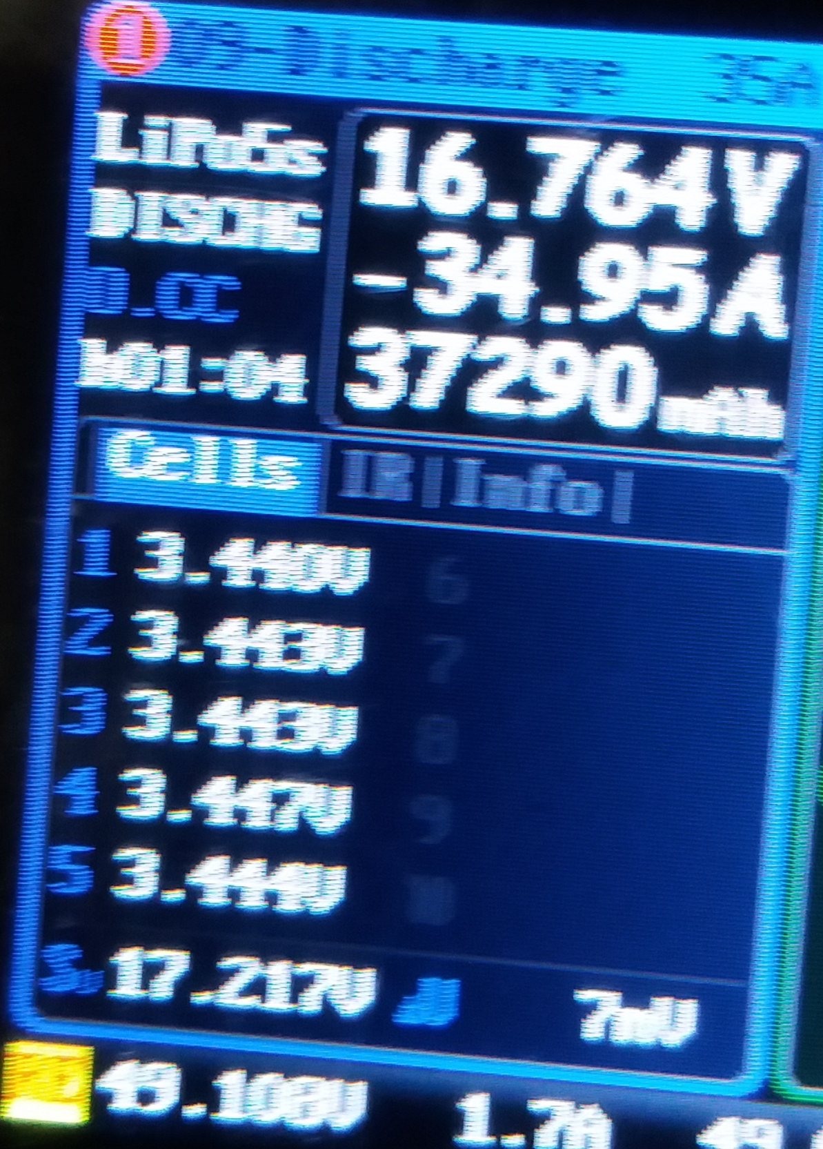 Bei den 40Ah Packs kamen 43Ah bei 35A Lade- und Entladestrom raus. Ich habe auch noch eine Reserve Zelle gefunden die minimal mehr Kapazität als die anderen zwei hatten, aber im großen und ganzen lagen die Zellen über 38Ah lang nur max 7mV auseinander, über 30Ah lang sogar nur 3mV.
