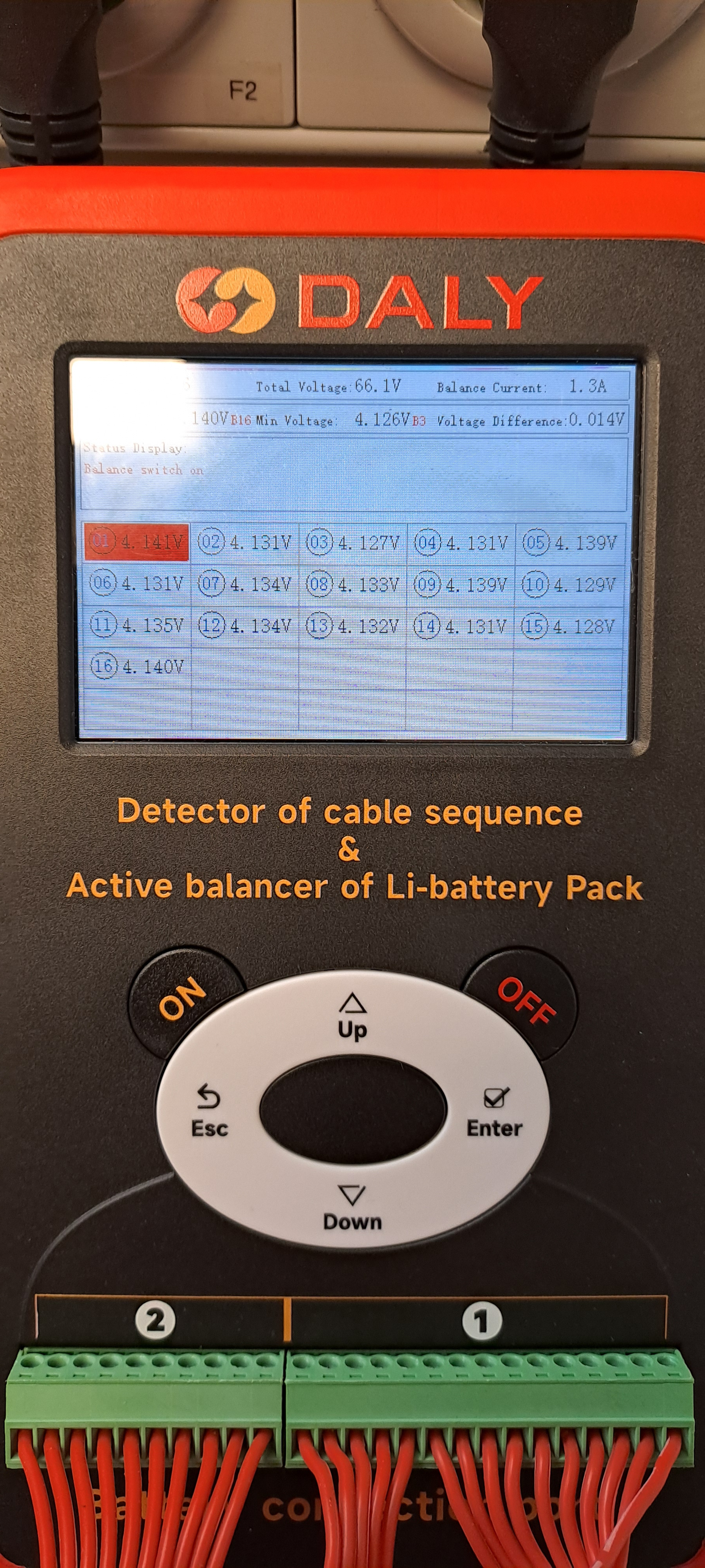 Jetzt wird gerade final geladen während ein externer aktiver Daly Balancer (einstellbar von 1-10A) sich ums balancieren kümmert, mit eingestellten 1A Balancerstrom sieht alles top aus. Das Teil von Daly ist echt klasse, auf das mitgelieferte Adapterboard passen die gängigen Balanceranschlüsse, somit ist das "plug and play".