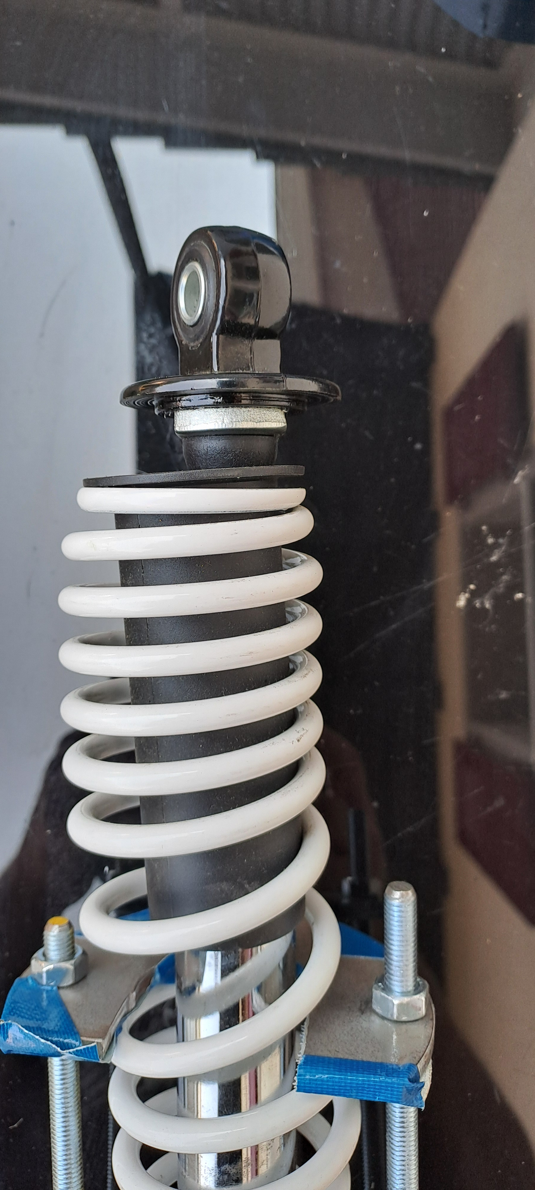 Als kurzerhand, mit Eigenbau Federspanner, das Federbein zerlegt. Als ich meine alten zerlegt hatte, dachte ich erst die Dämpfer sind durch. Fast keine Druckstufendämpfung, dafür ordentlich Zugstufendämpfung.