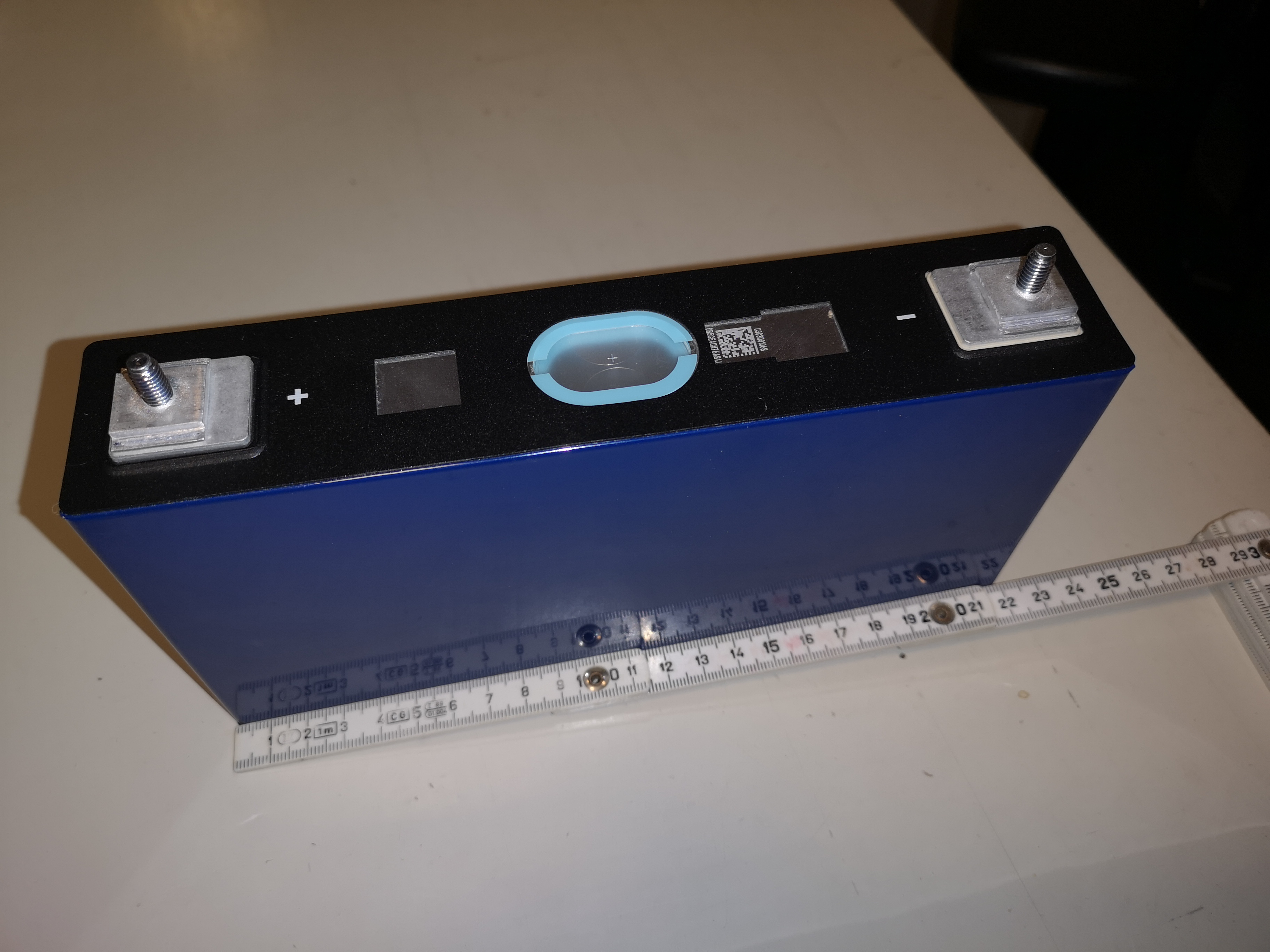 Ein paar Probemessungen ergeben eine einheitliche Spannung von 3,80V. Die Messung aller Zellen und des Innenwiderstandes steht noch aus. Da muss @error wohl mit seinem Messgerät ran.Größenmäßig passt es: 220x45x110mm. Lediglich die Höhe mit Gewindebolzen liegt mit 130mm etwas höher als erwartet. Mal sehen, ob ich in der dritten Etage sechs Module liegend unterbringen kann. Mehr kWh bekommt man jedenfalls in eine VX-1 nicht rein.