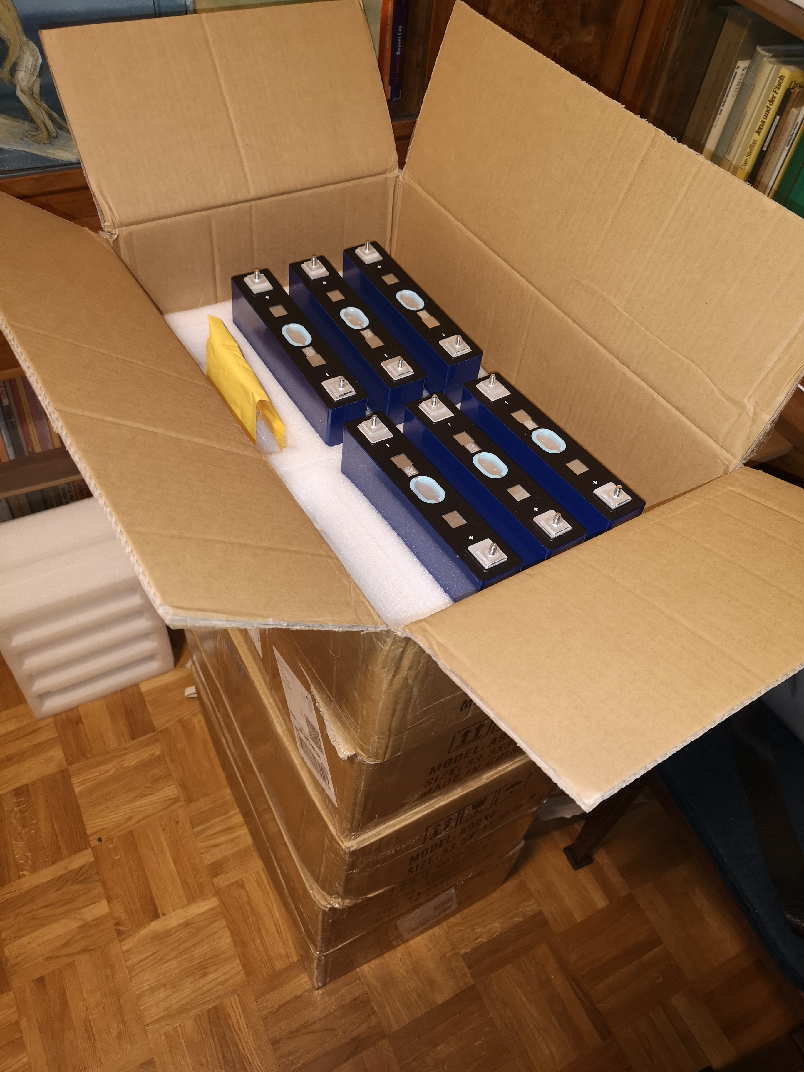 Vectrix mit Akku! In der zweiten Januarhälfte sollten die Zellen kommen. Heute, auf den Tag genau fünf Wochen nach der Bestellung, klingelt es ohne Vorwarnung oder Sendungsverfolgung an der Tür. Der dpd-Mann muss fünf Mal zum Auto laufen, und dann stehe ich vor gut 90kg Akkuzellen. Das sind ca. 2,5 kg x 36. Wow.