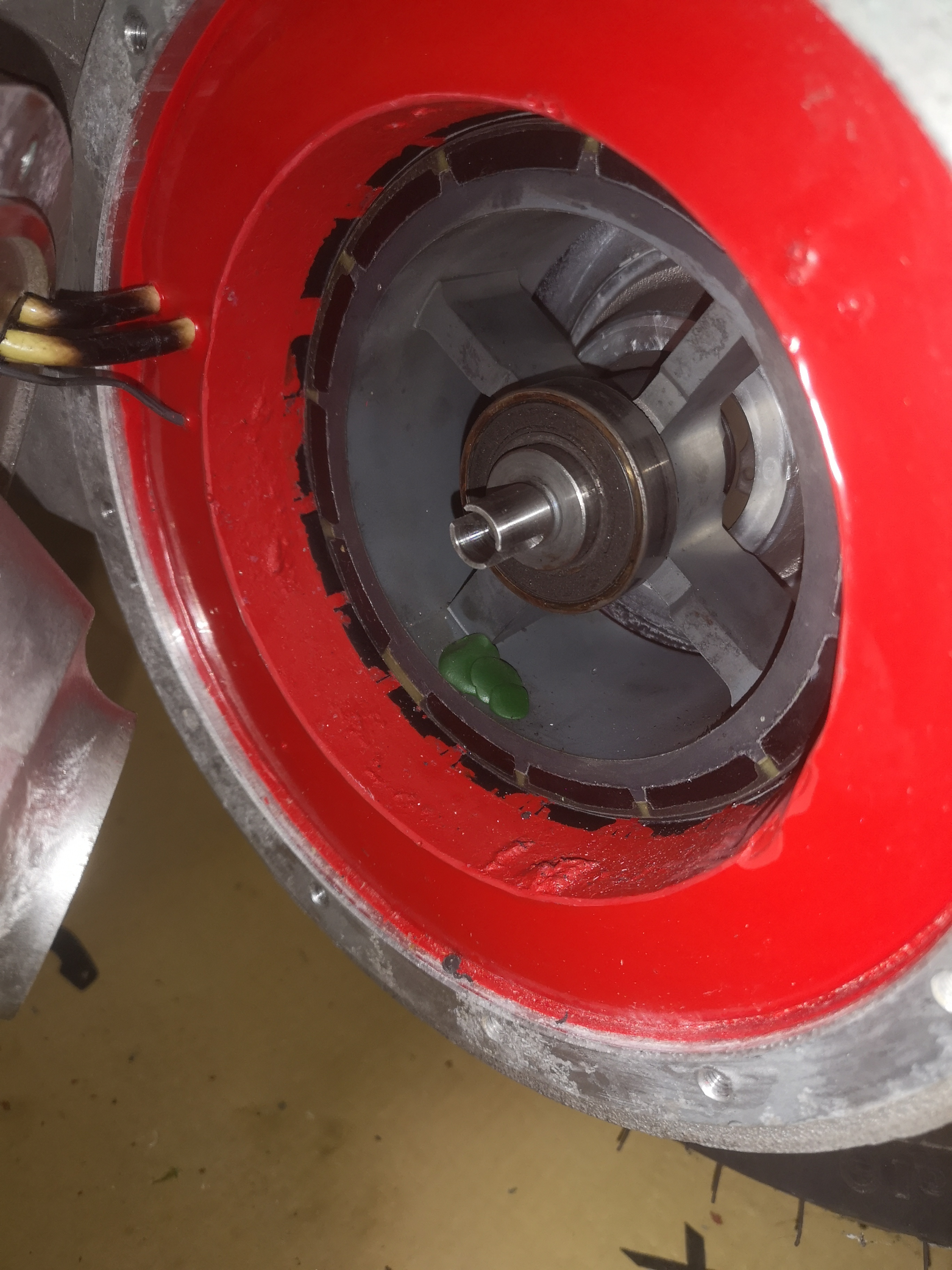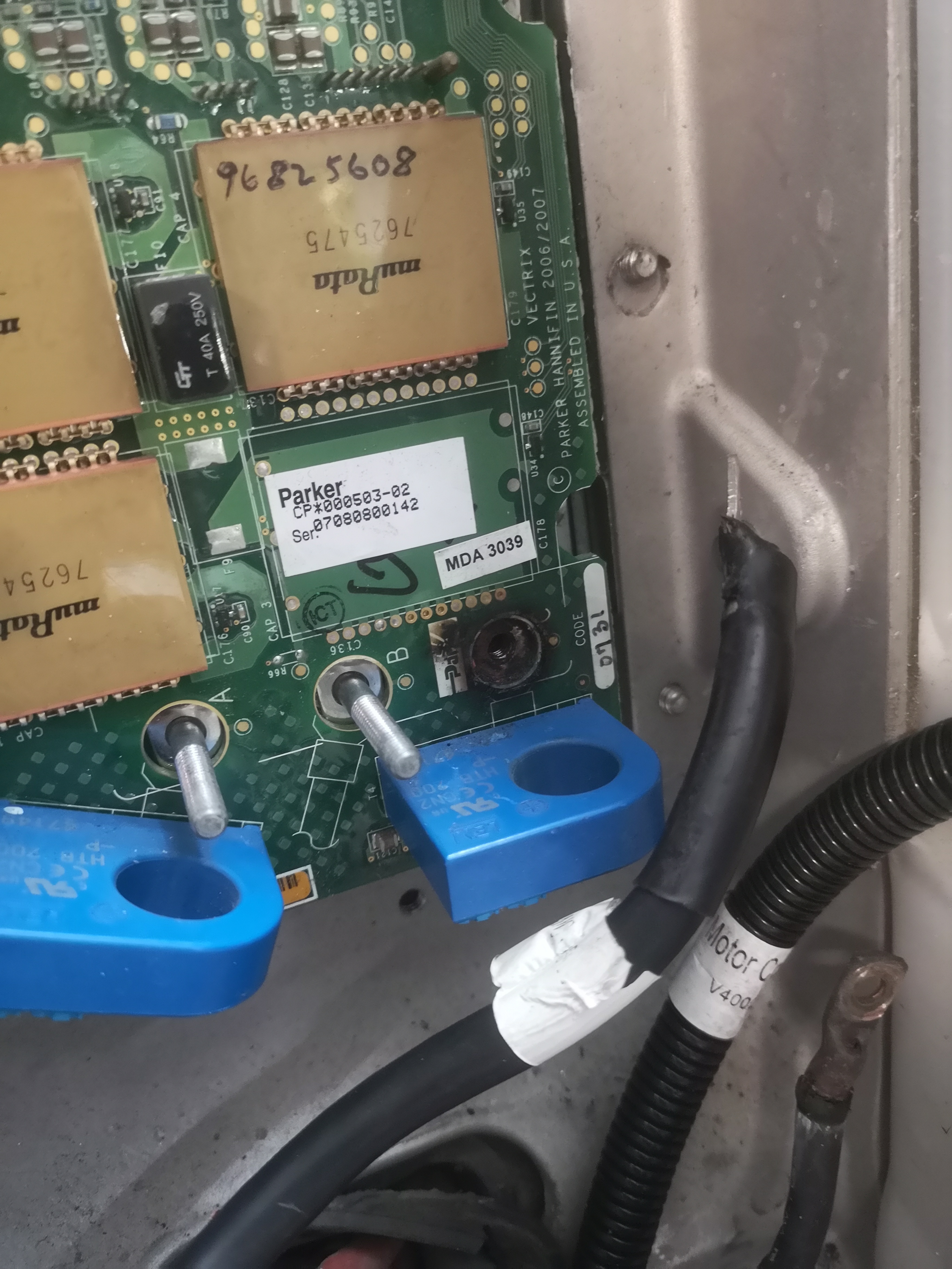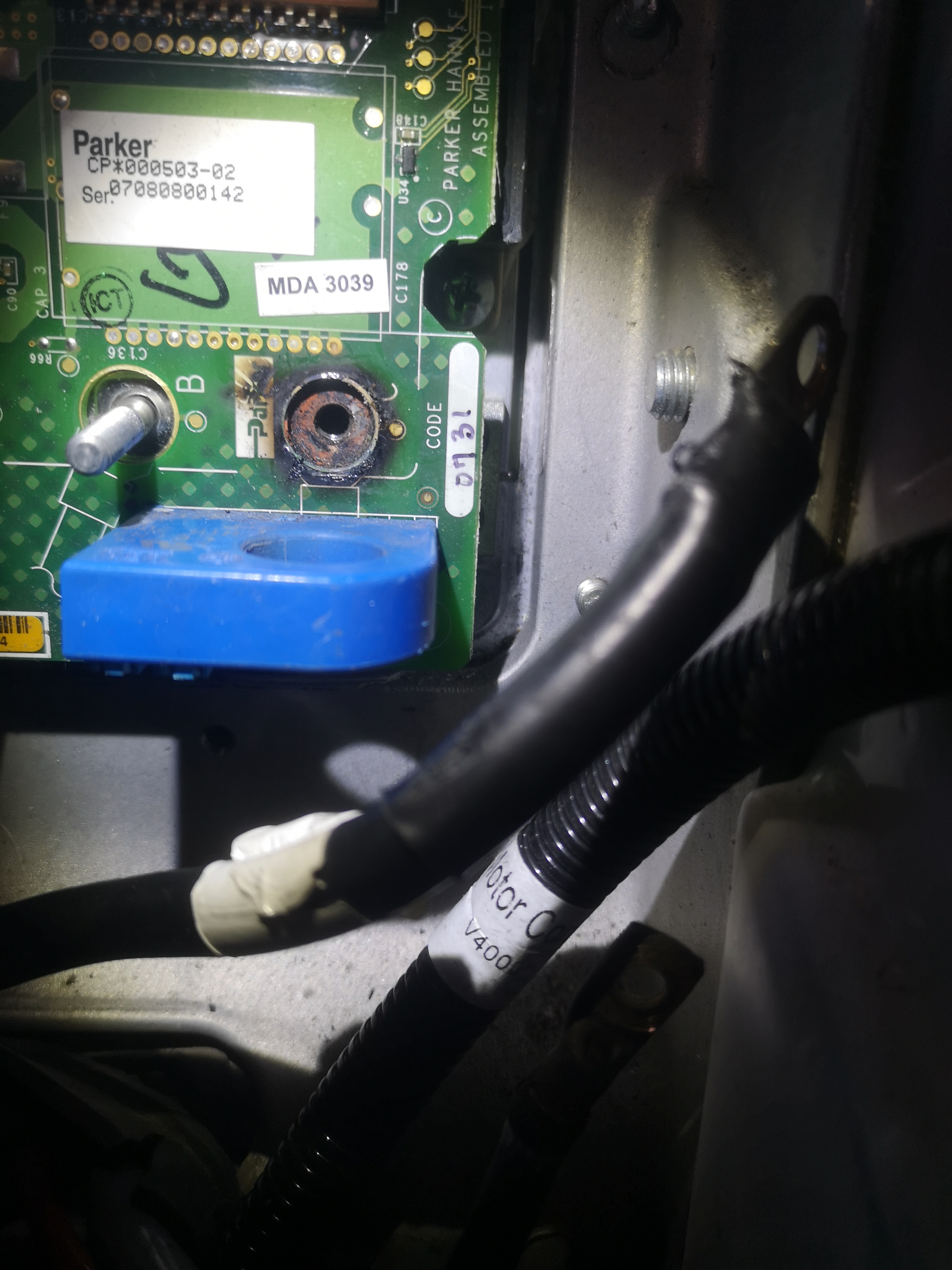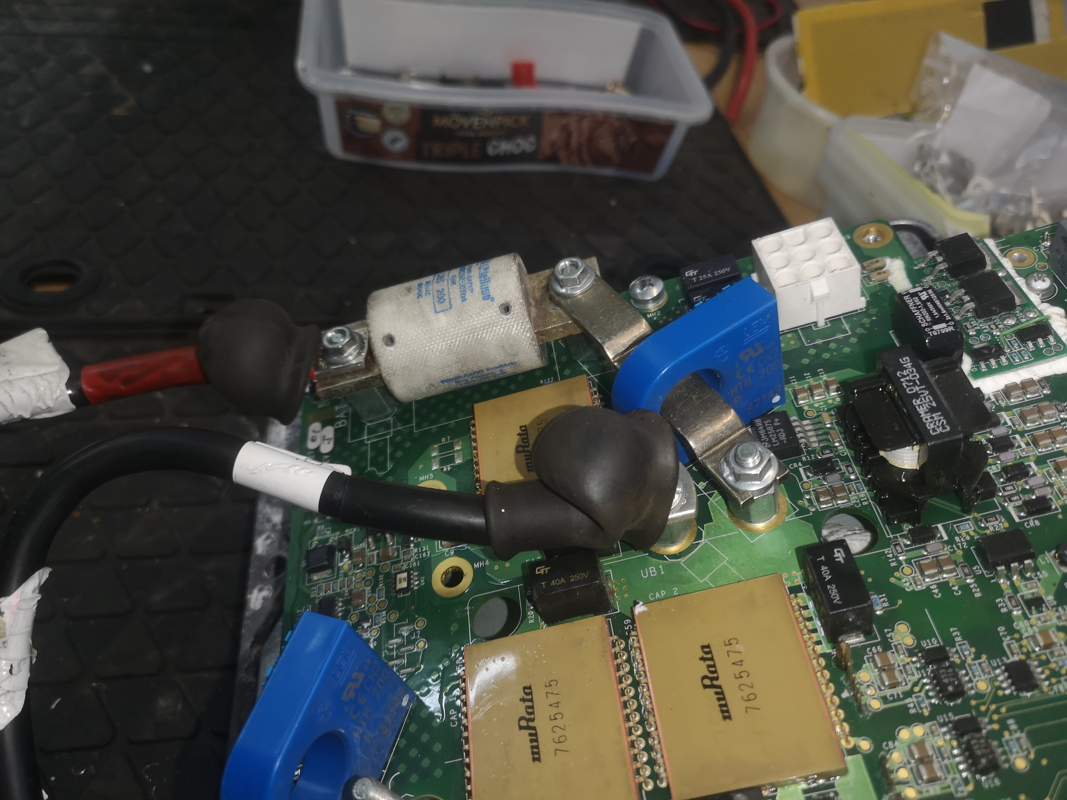 Auch an den Durchführungen zum Motor ist es den Phasenkabeln zu heiß geworden. Die übrigen Anschlüsse und die gesamte Controllerplatine sehen aus wie neu, auch wenn die Anschlüsse der Leistungskabel unterdimensioniert wirken.