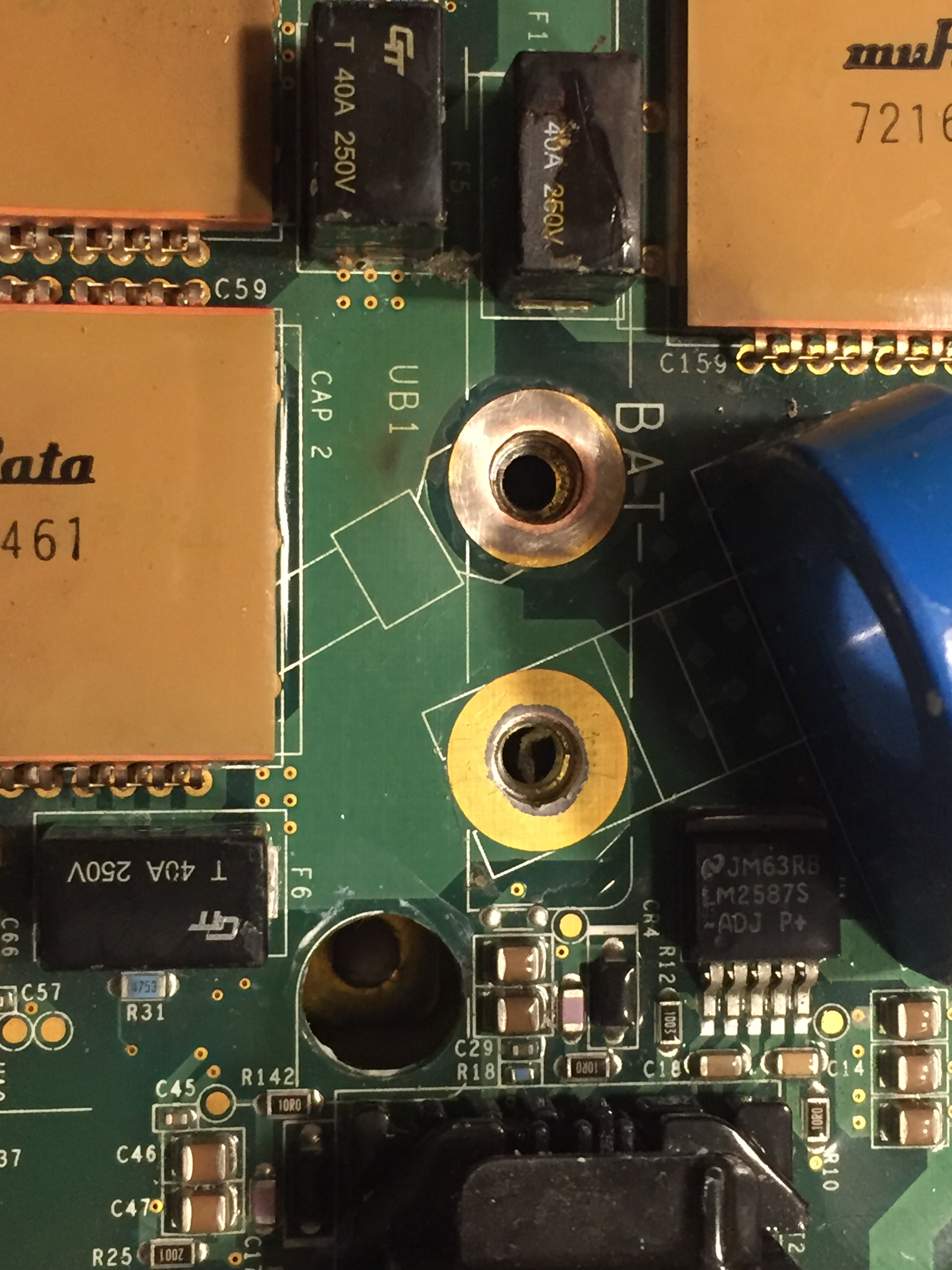 Vectrix hat unter die VBat Sechskant Terminals diese blödsinnigen geschlitzen Unterlegscheiben verbaut. Leider haben die sich in die weiche Platine eingearbeitet und dabei das Kupfer zerstört. So wie es aussieht ist das nur eine doppelseitige Platine. Das Plus-Terminal hat auf der Oberseite keine Verbindung und die Durchführung scheint hauchdünn ausgeführt. - Was zur Stromführung bleibt, ist die M5 Schraube, bzw. das Gewinde des Stahl Sechskants.