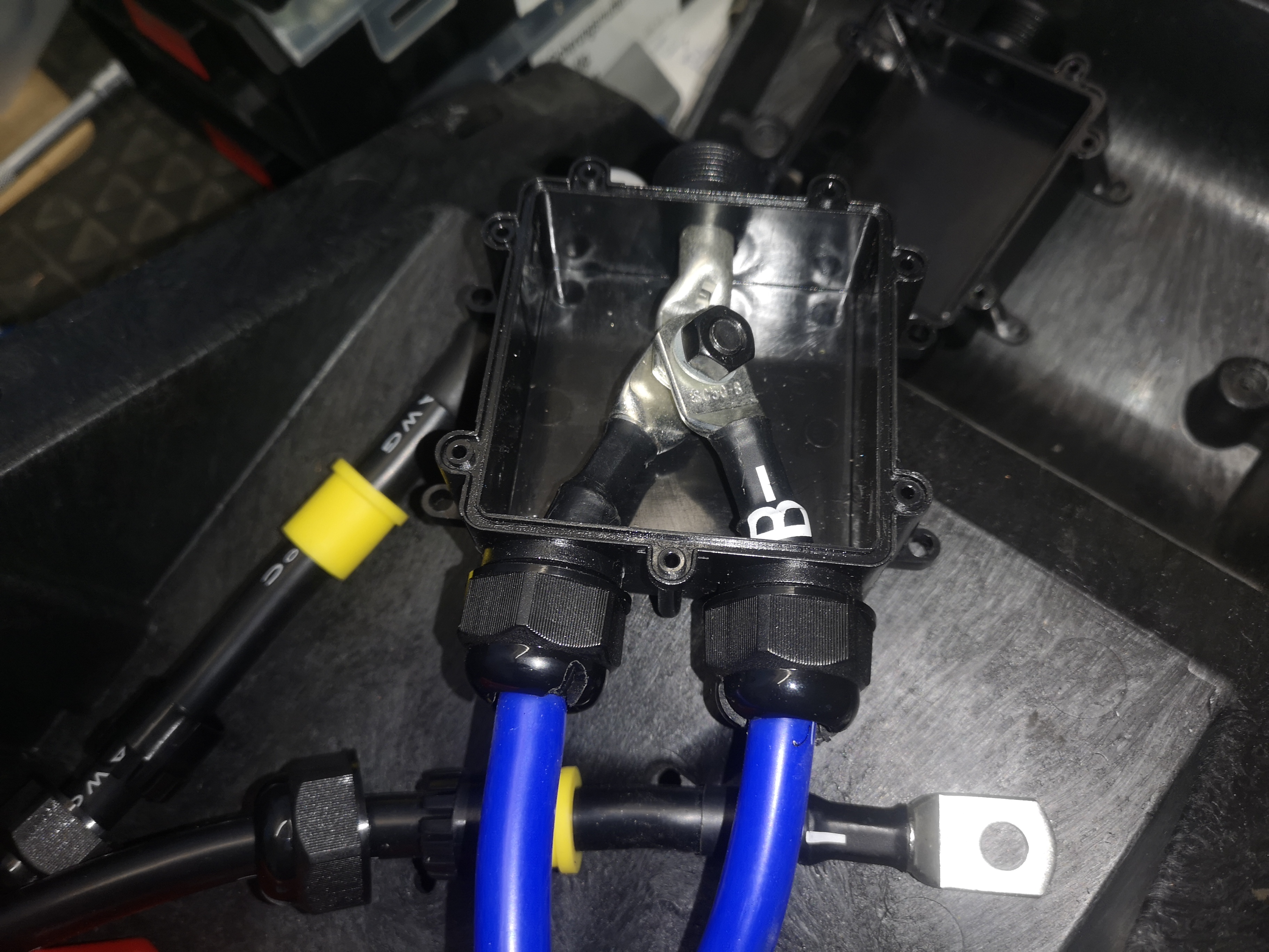 Die beiden 50mm²-Kabel jeweils für B- (Anschluss an den Akku) und P- (Anschluss an den Roller) müssen durchverbunden werden. Die Durchlässe der Dosen nehmen zwar die Kabelquerschnitte auf, nur die Ringkabelschuhe passen nicht hindurch. Daher musste ich die Schraubkappen und die Durchlässe mit Schlitzen versehen. Nach der P--Dose wird der Induktionsring vom Coloumbmeter über das Kabel geschoben. Anschließend kommt eine weitere Dose. Von dort verteilt es sich Richtung Controller, zum neuen DC-DC-Wandler und zum Anschluss für einen externen Lader. Schlussendlich braucht es noch einen Verteiler in der B+-Leitung für Konverter und Ladebuchse sowie die 12V-Verteilung. Diese Anschlüsse müssen auch noch abgesichert werden.
