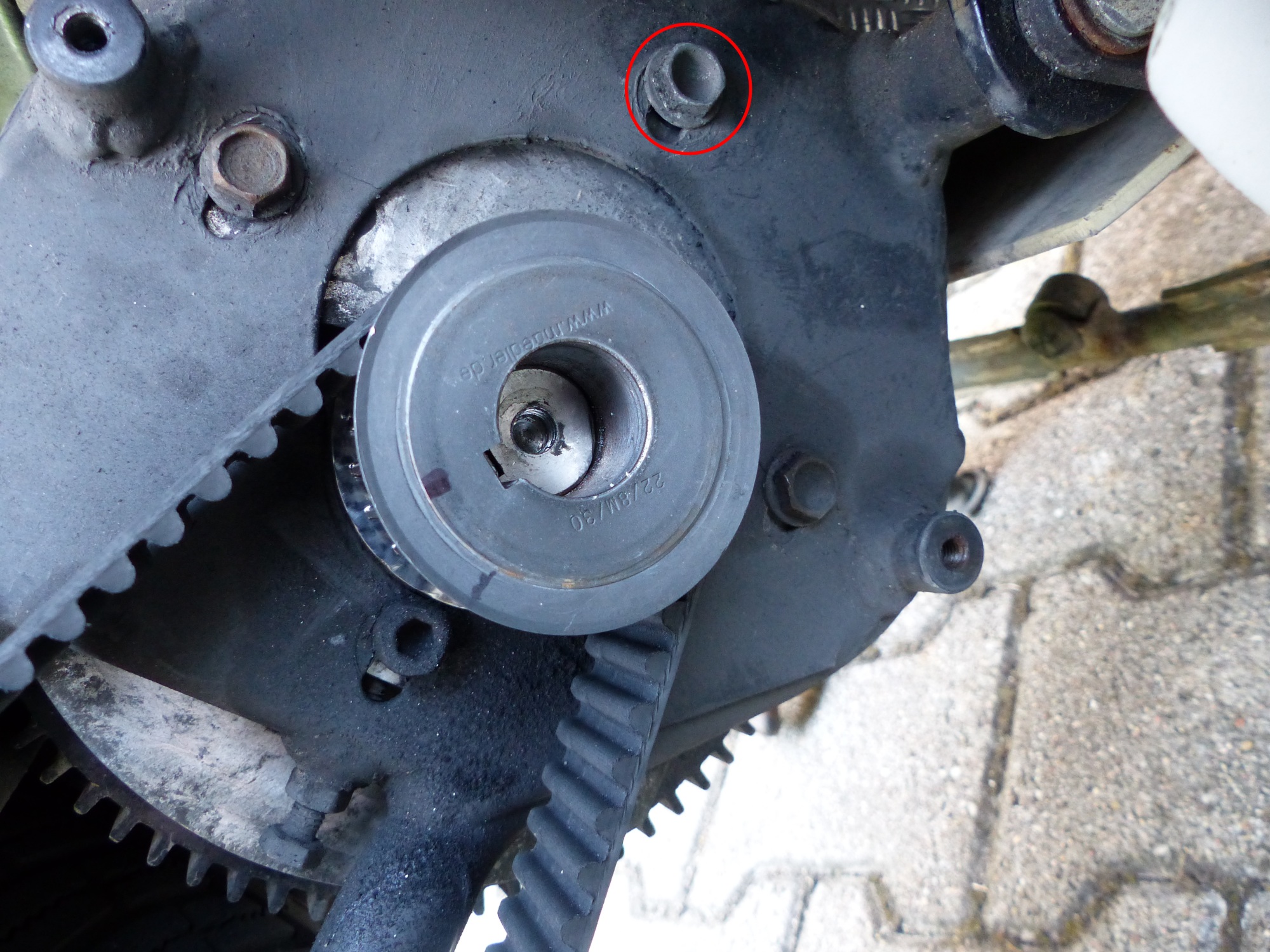 Riemen hinten ist jetzt ziemlich zentriert auf dem Riemenrad: Vorn liegt er wieder leicht an der inneren Deckscheibe an: