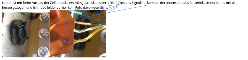 Leider ist mir beim Ausbau der Zellenpacks ein Missgeschick passiert: Die 4 Pins des Signalsteckers (an der Innenseite des Batteriekastens) hat es mir alle herausgezogen und ich habe leider vorher kein Foto davon gemacht.
