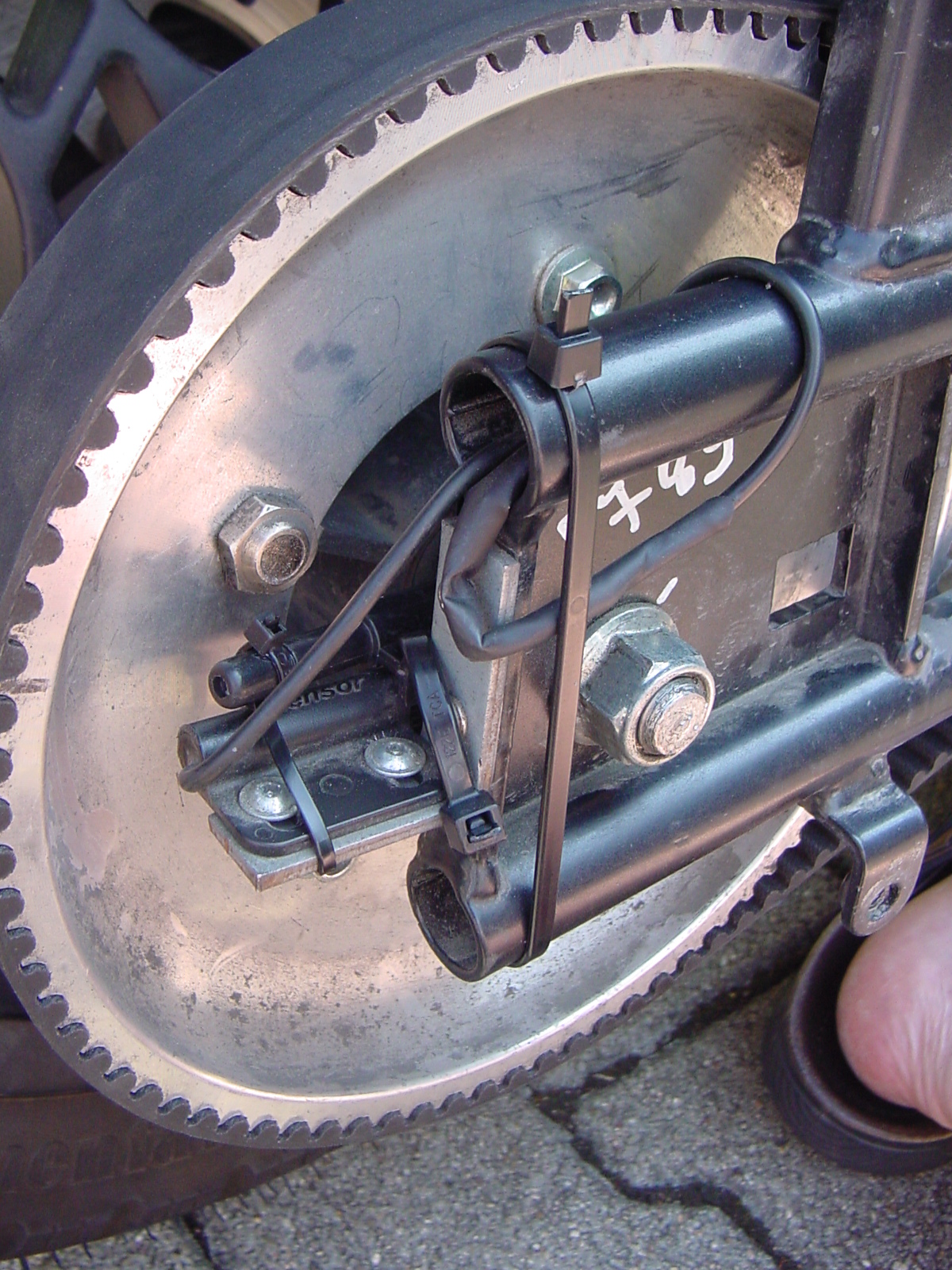 Ebenfalls wurde ein Hochschulentwickeltes BMS von der HV Kilian eingebaut, auf dessen Eigenheiten ich später noch eingehen werde. Meine Batterieheizung war jetzt auch an Bord und die zugehörige Verkabelung musste von mir nur noch marginal angepasst werden. Der Cycle Analyst V3 wurde auch integriert, aber leider erlaubte die direkte Versorgung des A.T.I.B DC-DC-Wandlers aus dem BMS statt aus dem Hauptstromkreis nicht, dessen Verbrauch ebenfalls vom CA mitloggen zu lassen. Den Geschwindigkeitsgeber (Reed-Kontakt) vom CA musste ich an der Hinterradeschwinge auch noch anders platzieren, da er exakt rechtwinklig zum Vorbeilauf des (serienmäßigen) Magneten in einer der 5 Zahnscheibenschrauben positioniert sein muss. Ich habe ihn mit zwei Kabelbindern direkt auf dem Geber vom vR one befestigt:
