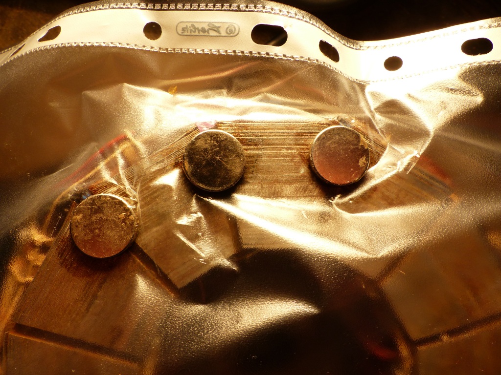 Schon vor einigen Wochen habe ich das JB-Weld Epoxi angewendet, um die drei Halls vollends zu fixieren im Rotor, und um die abstehenden Statorbleche wieder in den Verbund zu fixieren. Die Halls habe ich dabei mit einer Dokumentenhülle überdeckt und die Sensoren mittels drei Magneten am Stator in Position fixiert: