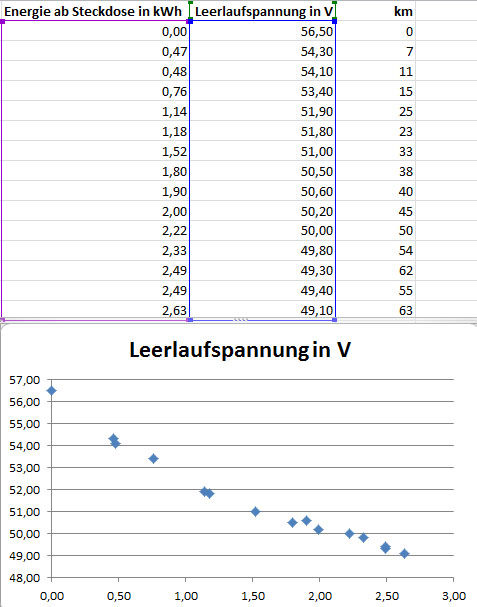 Da ich bereits nach ca. 10 Minuten nach Ausfahrt gemessen habe, beträgt die Leerlaufspannung im "beruhigten" Zustand etwa 0,3V - 0,4V mehr. Dies müsste man dann noch hinzuaddieren. (Danke an MERoller für den Hinweis!) Die 56,5V Lererlaufspannung des vollgeladen Akkus entspricht jedoch der (korrekten) Messung einen Tag nach dem Vollladen.
