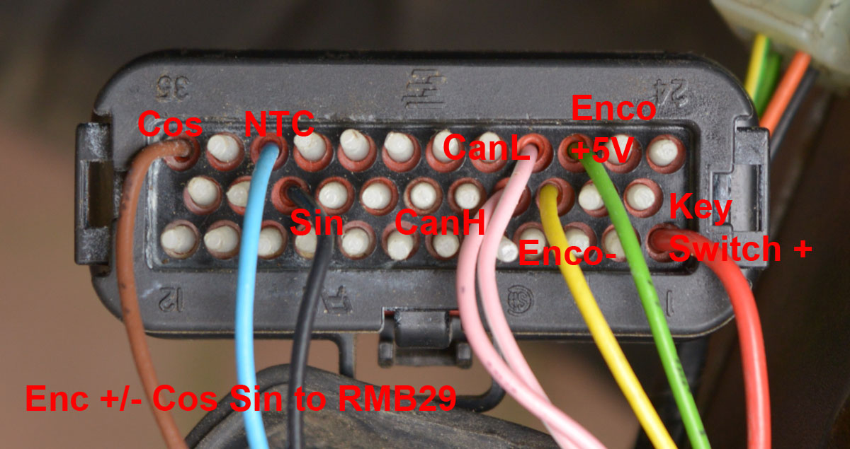 Etwas reduzierte Verdrahtung , Poti, Reverse usw. alles unbelegt. Belegt sind CAN low/hi sowie der RMB29 kpl (+/-5V,Sin,Cos) sowie ein Bein des NTC und +Bat am Keyswitch. Weicht leider etwas von der typ. SEVCON Beschaltung ab, das Manual geht aber auf Sin am Digital 8 und Cos am Pot 2 Power Supply in den Randnotizen ein. (only if specified in h/w build) Für einen E-MAX Umbau müßte ich den vermutlich tauschen (Gibt es die vorprogrammiert ?)