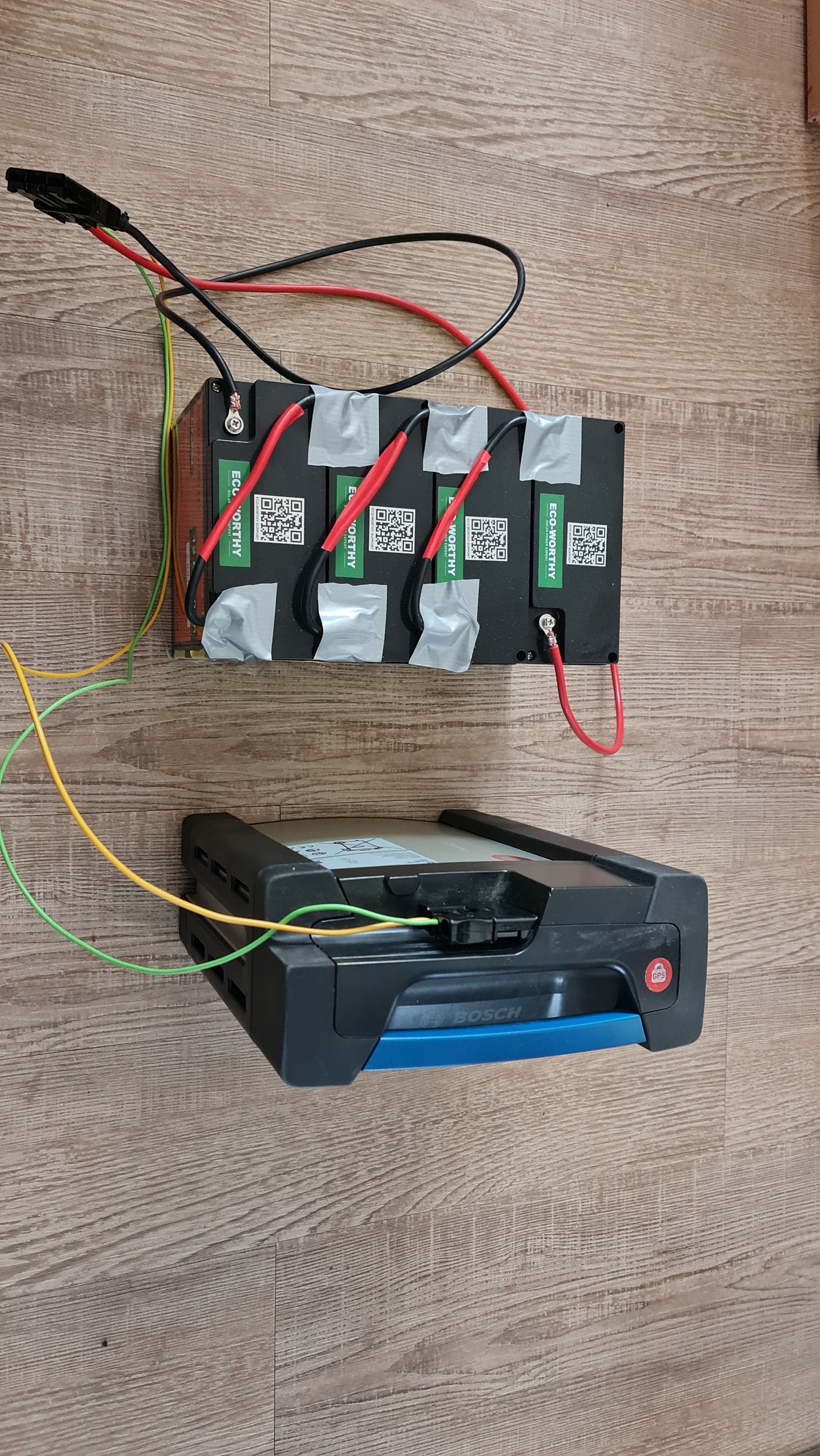 Ein 14s wäre mit Ladeschlusspannung von 58,8 Volt ja zum 20s LiFePO4-Hilfsakku besser passend. Wahrscheinlicher ist aber wohl ein 13s mit Ladeschluss bei 54,6 Volt; gerade wenn erst die Entladung des LiFePO4-Akku beobachtet wird und der Originale erst später Ladeprozente verliert.