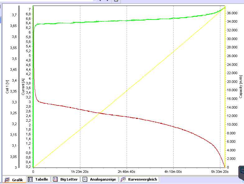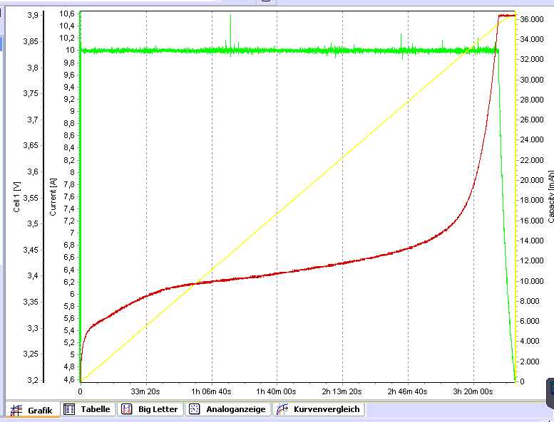 Laden mit 10A; ( bei den nächsten muss ich die obere Spannung mal noch auf 3,65V setzen ) Entladen mit 6A Für eine neue 40Ah Zelle mit so wenig Belastung sollte da doch mehr drin sein oder ?