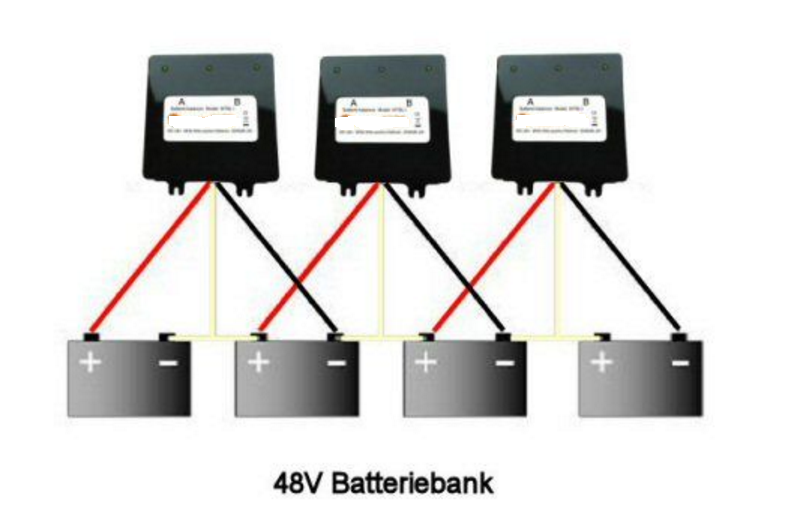 Vier in Reihe geschaltete Blei Batterien können nie gleich sein, wenn es keinen Balancer dazwischen gibt.
