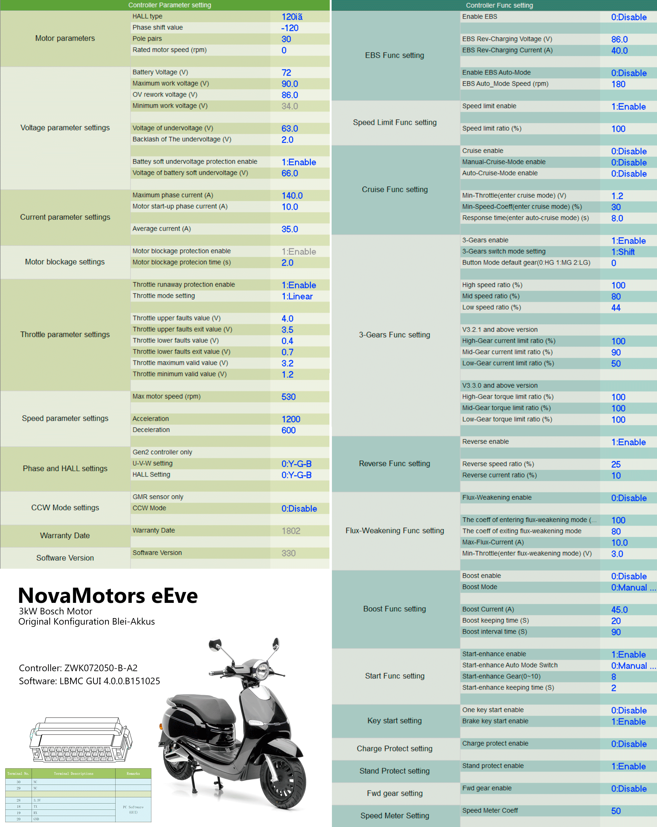 Ich habe mir auch im Vorfeld die hier erwähnten Adapter/Kabel gekauft. Mit der Software LBMC GUI 4.0.0 konnte ich meinen Controller ZWK072050-B-A2 auslesen. Unter den "Voltage parameter settings" habe ich die 90V unter "Maximum work voltage" so interpretiert, dass ich mit den 84V (im voll geladenen Zustand) des neuen Li-Ion Akku keine Probleme bekommen werden.