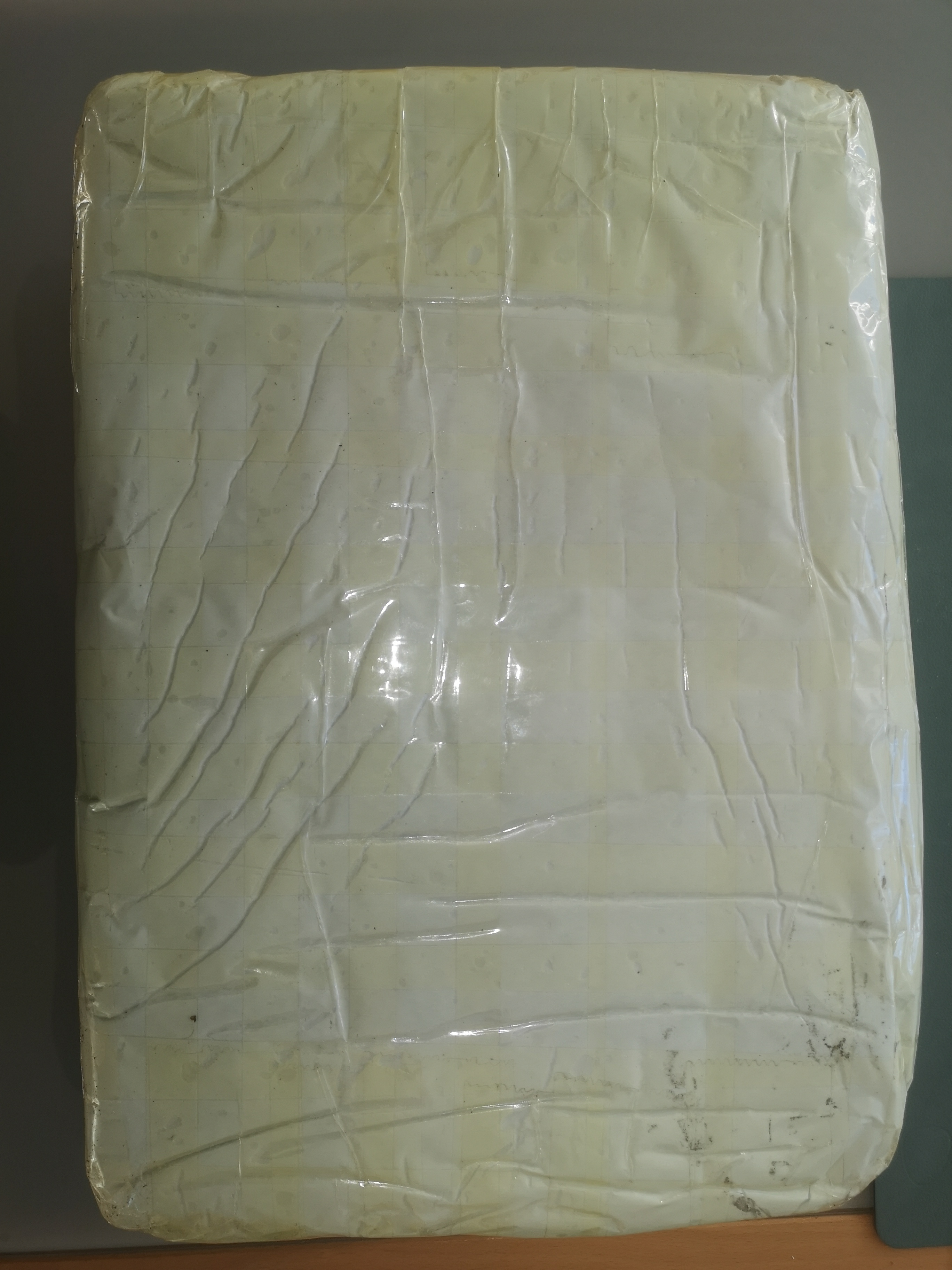 Von außen fiel mir auf, dass die Folienhülle aus recht brüchigem Material an einer Schmalkante aufgerissen war. Dann habe ich die Hülle vorsichtig aufgeschlitzt.