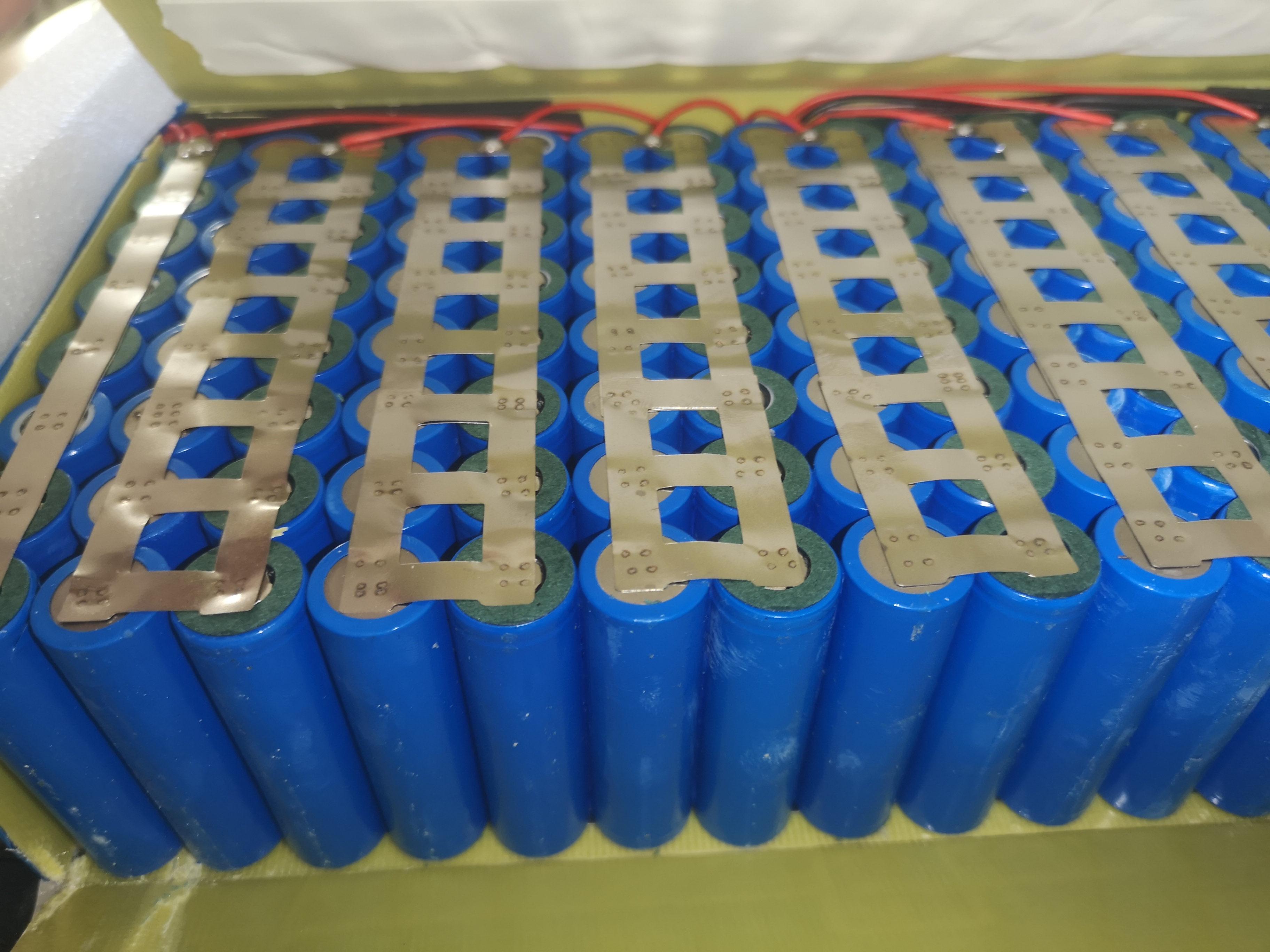 Das gesamte Paket ist ohne Spacer aufgebaut. Also sind die schlecht isolierten Zellen direkt miteinander verklebt. Hinzu kommt, dass die B+/B- Kabel nicht an überhängenden Fähnchen befestigt sind, sondern direkt auf den Zellpolen aufgelötet wurden. Eine Ecke hat einen Stoß abbekommen. Mehrere Zellen sind zusammegedrückt. Die dünnen Nickelstreifen sind verbogen bzw. sogar eingerissen. .
