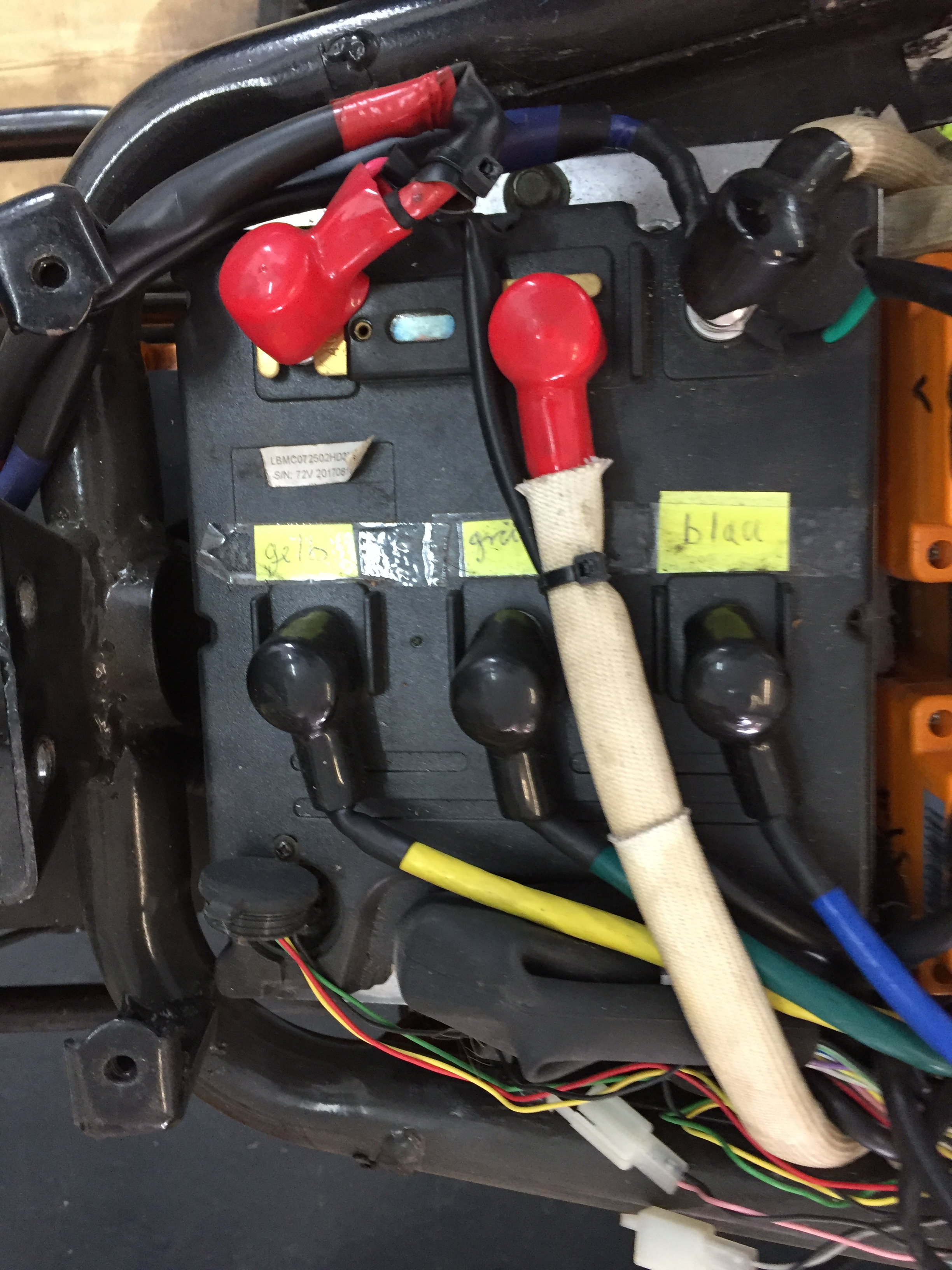 Auf dem Bild vom Verteiler kann man erkennen, dass sogar Schrumpfschlauch mit eingeklemmt ist. Das dicke Kabel links oben in der Ecke geht quasi vom Rahmendreieck zum hinteren Ende der Sitzbank (dort sitzt die abgebildete Sicherung), dann von dort nach vorn zum Controller, der sich unter dem Fahresitz befindet. Kabel scheint nichts zu kosten? 8-)