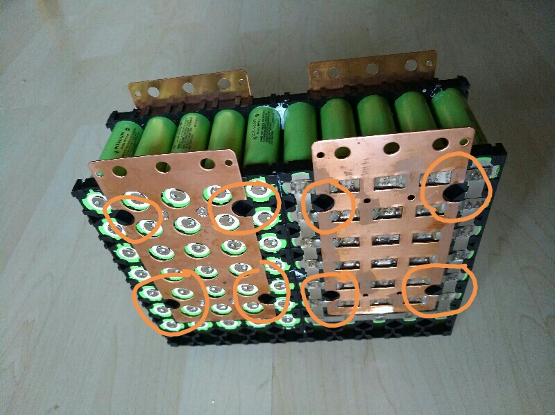 Wenn du dir die Kupferbleche genau ansiehst, haben die so halbrunde Einbuchtungen (Orange Kringel). Wenn alle 11 Blöcke fertig sind kommen an diesen Stellen Gewindestäbe M4 mit Isolierschlauch durch, um die gesammten 11 Blöcke zusammen zu halten. Die Gewindestangen sind logischerweise so lange wie der Gesammte Akku und gehen durch alle 11 Blöcke. An sich sind die Zellen damit schon leitend verbunden, da die Bleche der Minus- und Plusseite der einzelnen Blöcke aufeinander liegen.