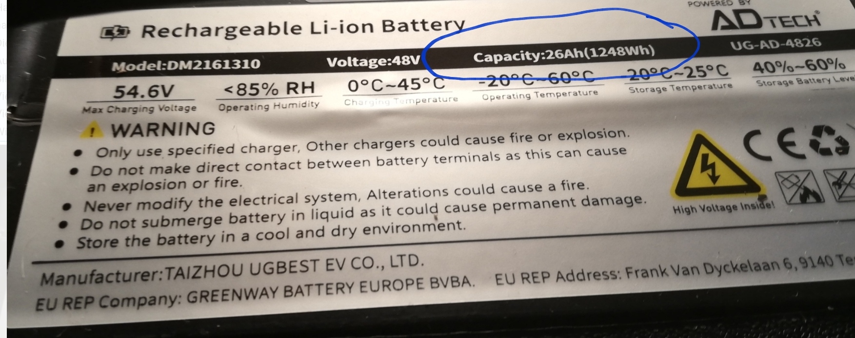 Die Akkus haben eine Kapazität von 26Ah = 26 Amperestunden bzw. 1248Wh = Wattstunden.