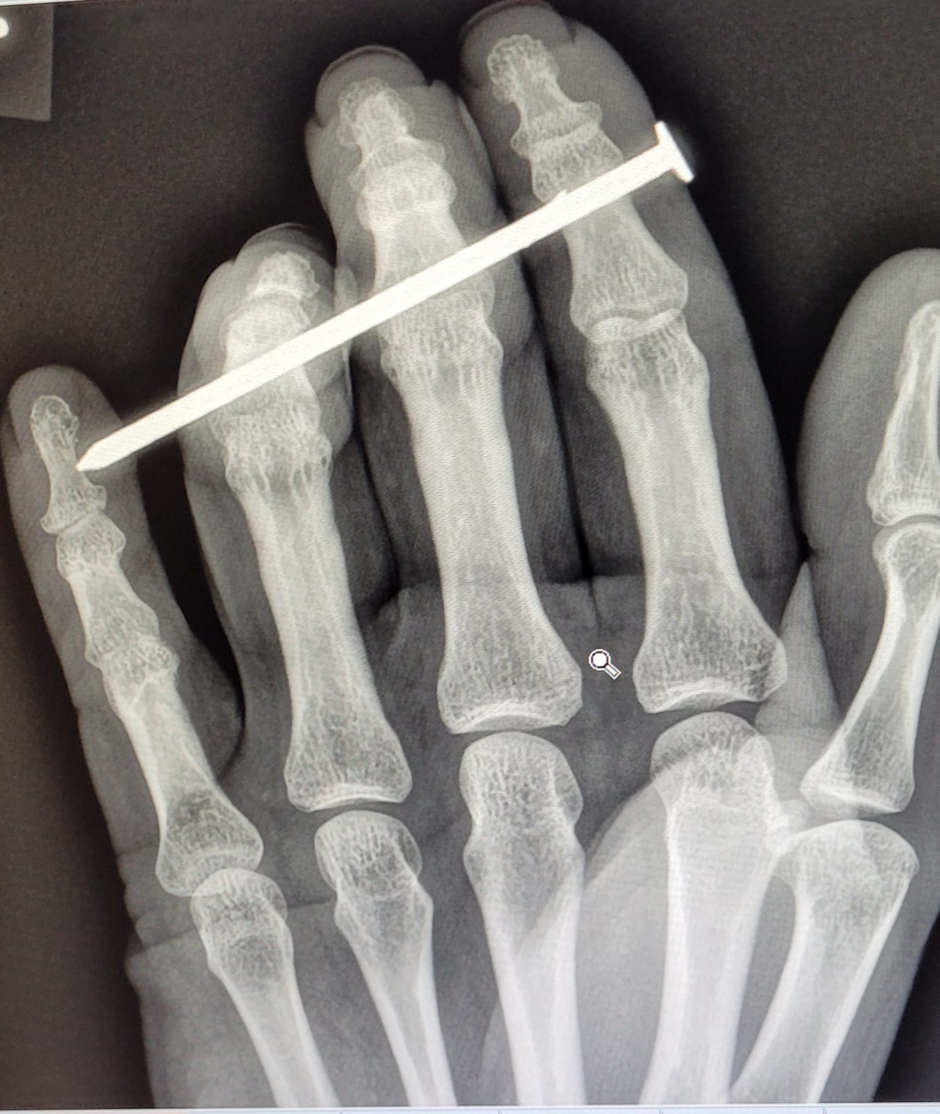 Wenn der Nagel bei abgewinkeltem Ringfinger durchgeschossen wurde- warum sollte er dann nicht auch beim Röntgen noch angewinkelt sein?
