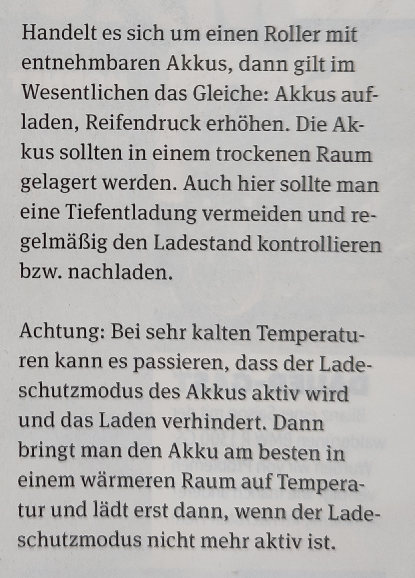 Wenn man Erfahrung hat, wieviel Energie die Roller-Elektronik und die Akku-Überwachung des jeweiligen BMS je Monat verbraucht, mag man im Herbst dann vielleicht einen 70% Ladezustand anstreben, der im April noch nicht unter 40% abgefallen ist. Ohne die Erfahrung würde ich jedenfalls auch Volladen im Herbst empfehlen.