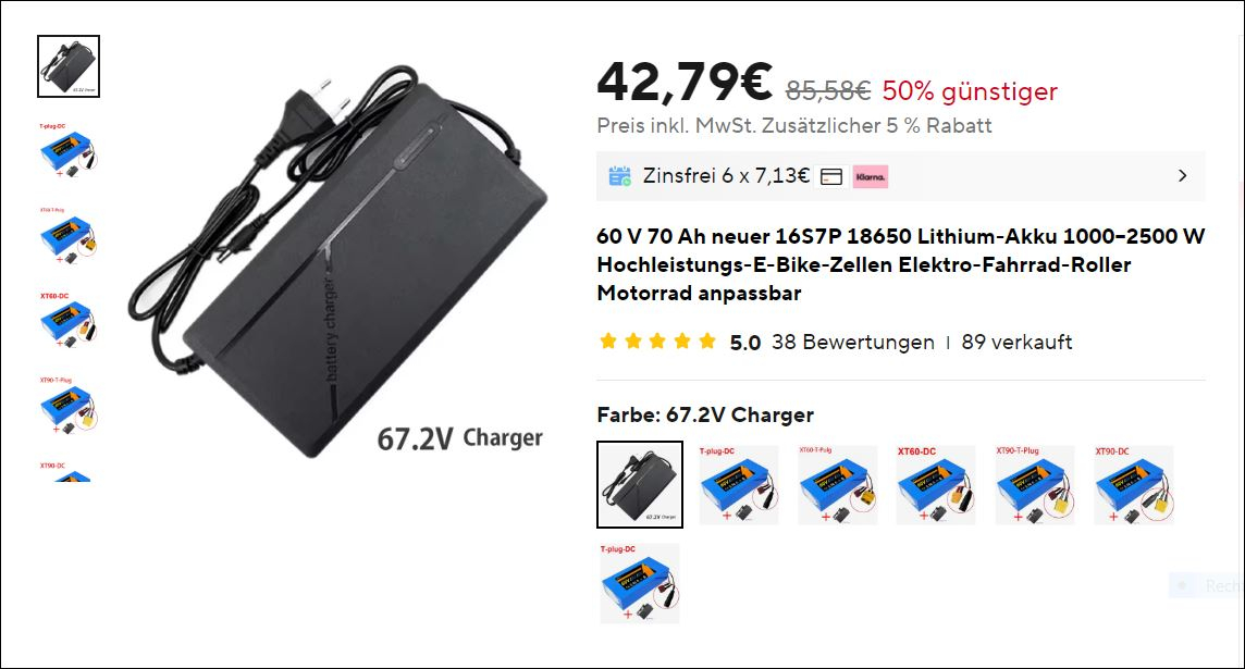 Auf jeden fall passt da die Spannung von 71.4V des Ladegerätes genau zu meinem Ladegerät.