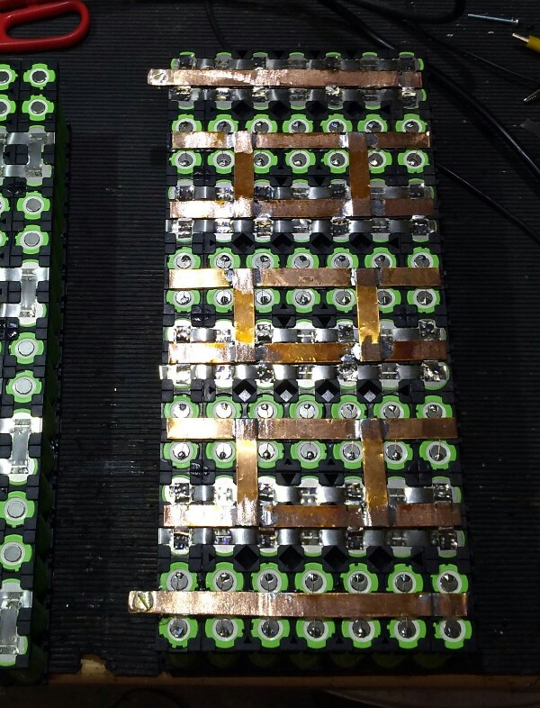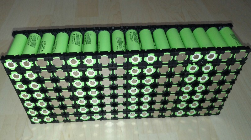 Mit 3.450mAh Samsung wären 13s10p= 48V 34,5Ah = 1,6kWh möglich.