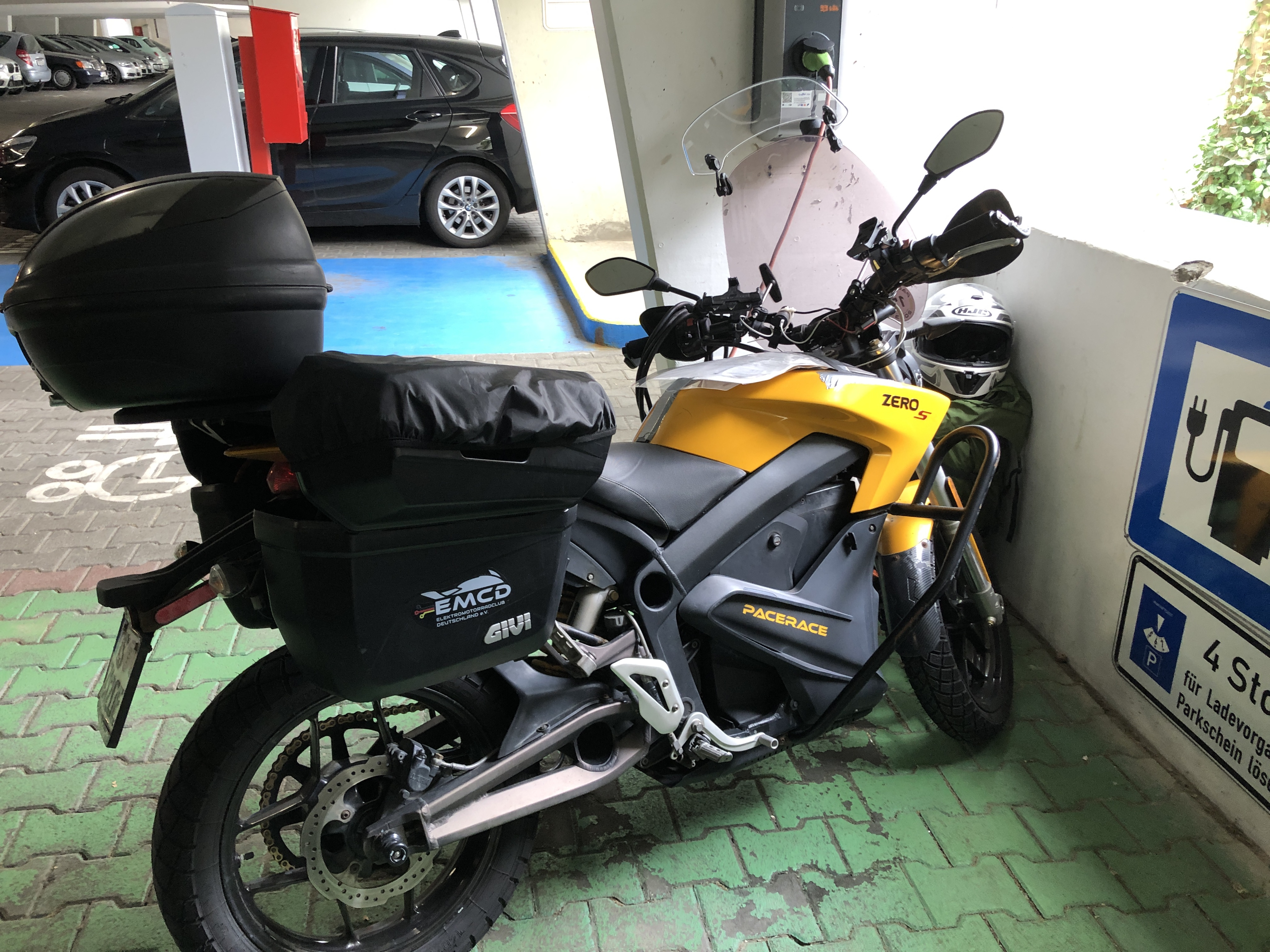 Der letzte Stint bis Weyarn war dann wenig aufregend, wo ich um 17:45 Uhr, nur eine halbe Stunde später als geplant ankam. Nach dem Einchecken im Alten Wirt musste ich um die Ecke fahren zu einer Energie Südbayern Ladesäule, die von den Organisatoren schon mit Schukoverteilern ausgerüstet war und keine Blockiergebühren nach 4h erhob, so dass sich die Zero die Nacht über wieder gemütlich nur mit dem Onboard Lader vollnuckeln konnte.