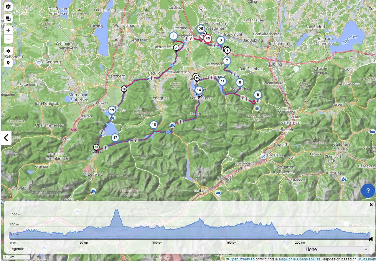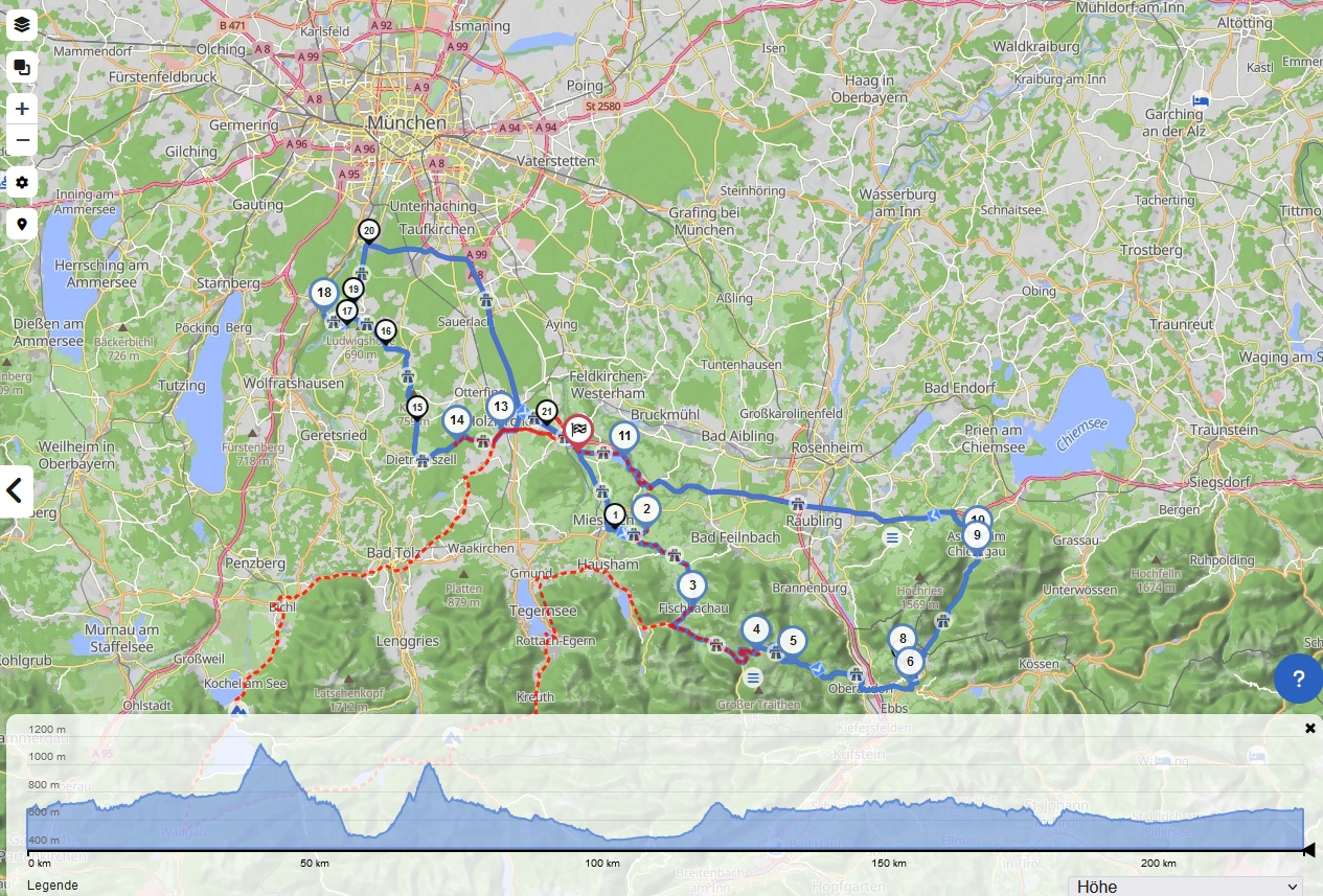 Die Planung dieses Jahr war jedoch die schwierigste bislang, weil zwei Lokal-Mathadore gleich 38 Wege- und Fotopunkte definiert hatten! Oberbayern und Österreich bieten natürlich extrem viele tolle Ecken und Straßen! Aber das hat sicher nicht nur Most und mich massiv gestresst, so viel mussten wir streichen, weil schlicht unerreichbar! Most hatte sogar im initialen Frust überlegt, schlicht auf einer möglichst leeren Autobahn in der Gegend unentwegt km zu schrubben mit seiner Energica Experia
