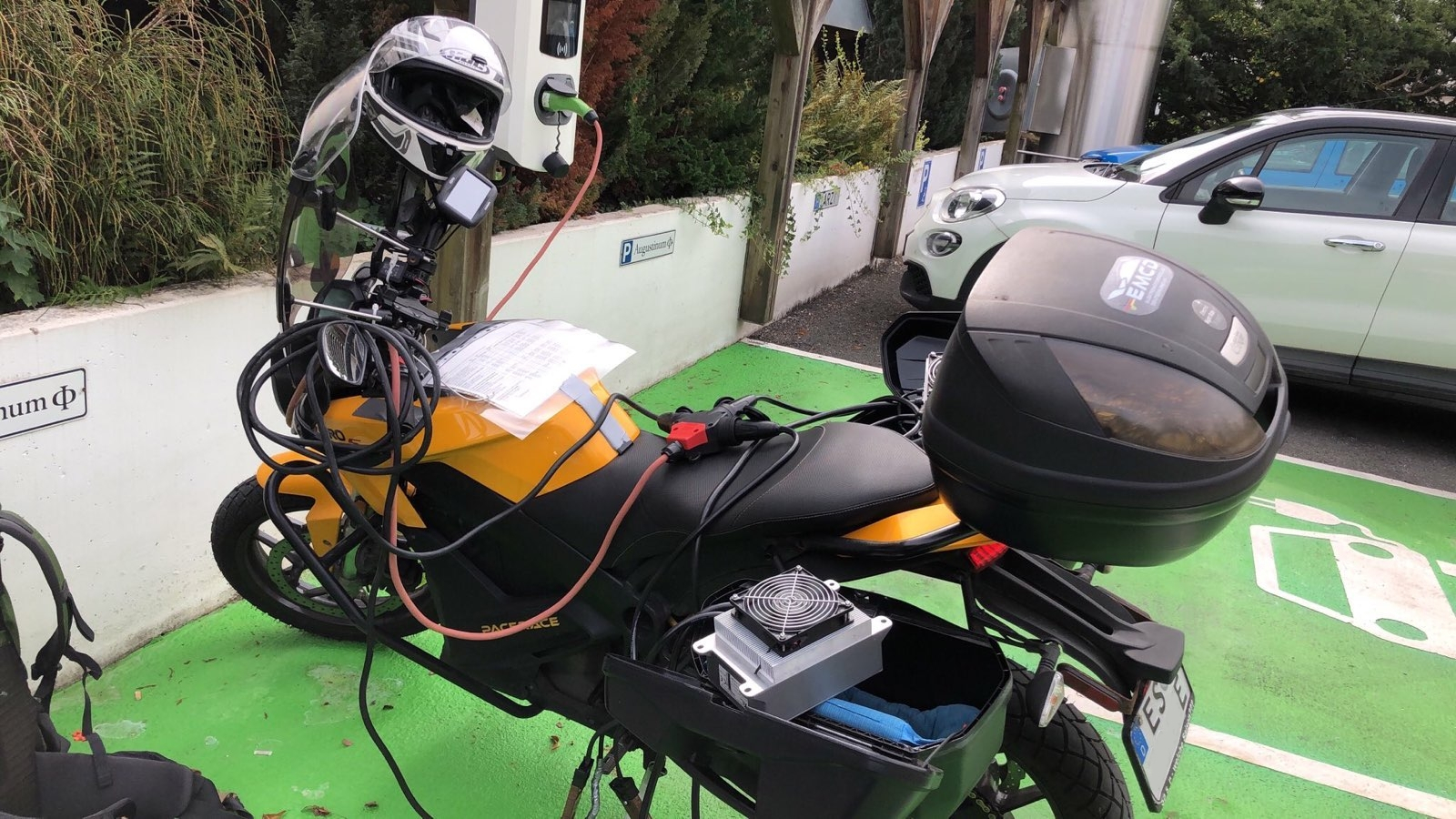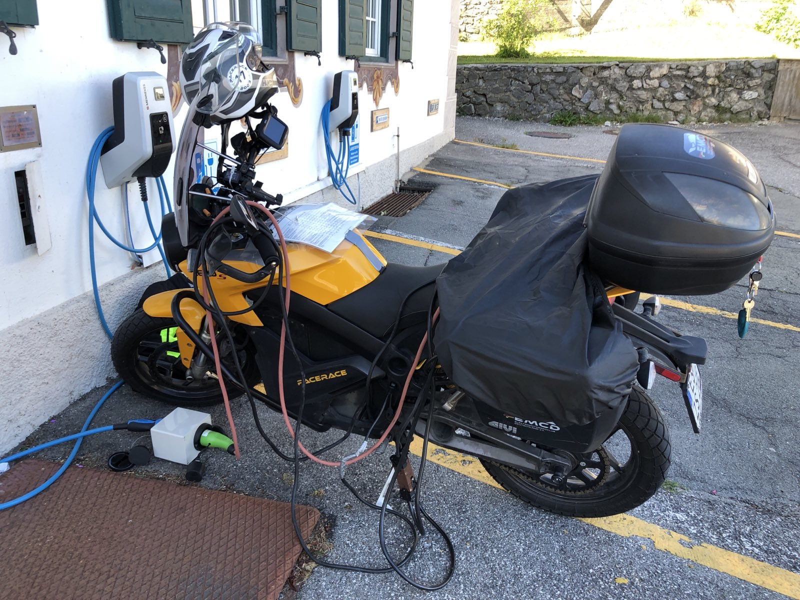 Ich mache ja normalerweise keine Bilder von meinem Essen, aber hier musste ich eine Ausnahme machen, so lecker war das: Nach dem Essen noch kurz für kleine Jungs, dann zurück zum Mopped, lud noch munter weiter, und etwas oberhalb an einen Poller gelehnt. Ein jüngerer Herr bewegt sich prüfenden Blickes auf meine Ladekontraption zu, schaute sich alles ganz genau an, gründlich. Irgendwann ging ich zurück und fragte ihn, ob etwas nicht in Ordnung sei, und es entspann sich ein sehr interessantes Gespräch über den aktuellen Stand der Elektromobilität