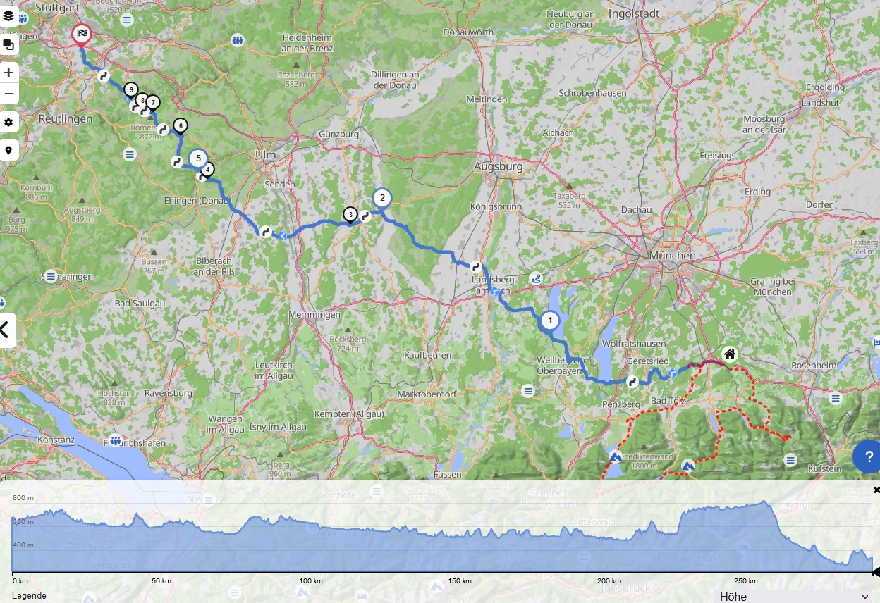 Zuerst wollte ich eine 8 mit ganz viel A8 fahren (Quiz war beim Start/Ziel am Alten Wirt in Weyarn), doch Hauptorganisator Thomas hat mir das glücklicherweise ausgeredet (immerhin war an dem Wochenende Ferienende in Bayern und Baden-Württemberg!), und hat mir nach einiger Überlegung eine machbare und vor allem Südrunde vorgeschlagen. Aus diesem Plan wurde somit in fast unzähligen Schritten dieser Plan: Als erstes in Kurviger geplant (siehe obige Screenshots), dann in ABetterRoutePlanner nachgebaut und Ladestopps (zwei) optimiert. Die Planung wurde schon massiv vereinfacht, weil die Lokal-Mathadore auch die Wegepunkte als gpx Dateien zur Verfügung stellten, die in Kurviger und schlussendlich auch im alten Garmin Planungstool BaseCamp importiert werden konnten. Denn in letzterem musste ich meine Strecke auch noch nachbauen, da die Daten nur so in mein altes Garmin Zumo Navi exportiert werden konnten.