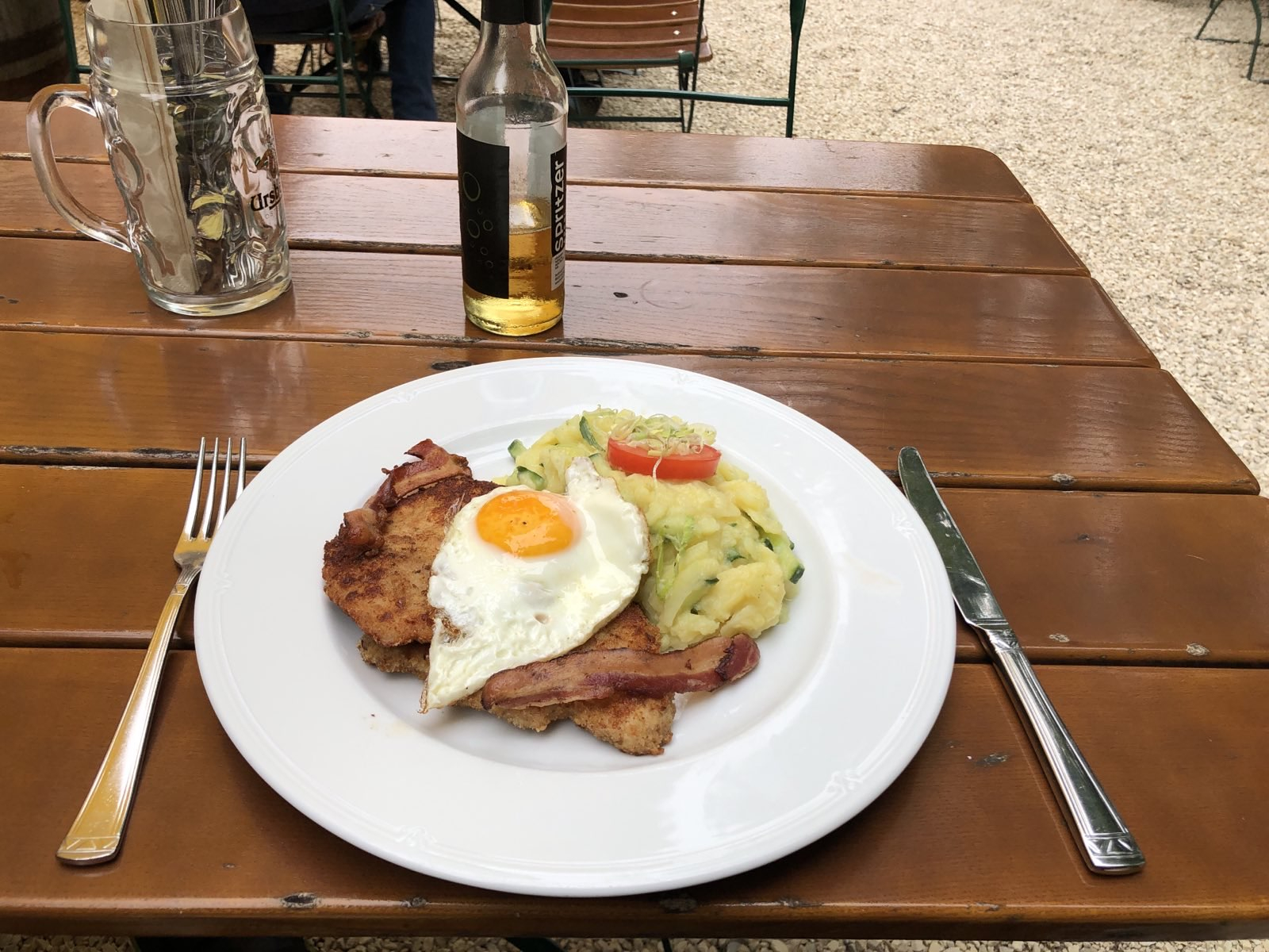 Einziges Problem: um 12:50 rum war der komplette Biergarten vom Klostgerbräuhaus mit Gästen belegt. Ich irrte umher, legte schlussendlich meinen Rucksack, Helm und Motorradjacke an einem Bierfass ab, das oben eine Platte als Tischchen trug, und fragte eine Bedienung, wie ich etwas bestellen könne, und ich würde dann halt an einem solchen Fass im stehen essen. Das überhörte ein Pärchen am Nachbartisch, die sagten, sie würden demnächst aufstehen, so dass ich mit Tisch 6 als Ziel innen an der Bestelltheke bestellen konnte. Was aber gute 10 Minuten dauerte wegen Warteschlange. Als ich endlich rauskam, stand gerade die Dame als letzte auf und ging. Sie hatte mir den Tisch solange noch freigehalten