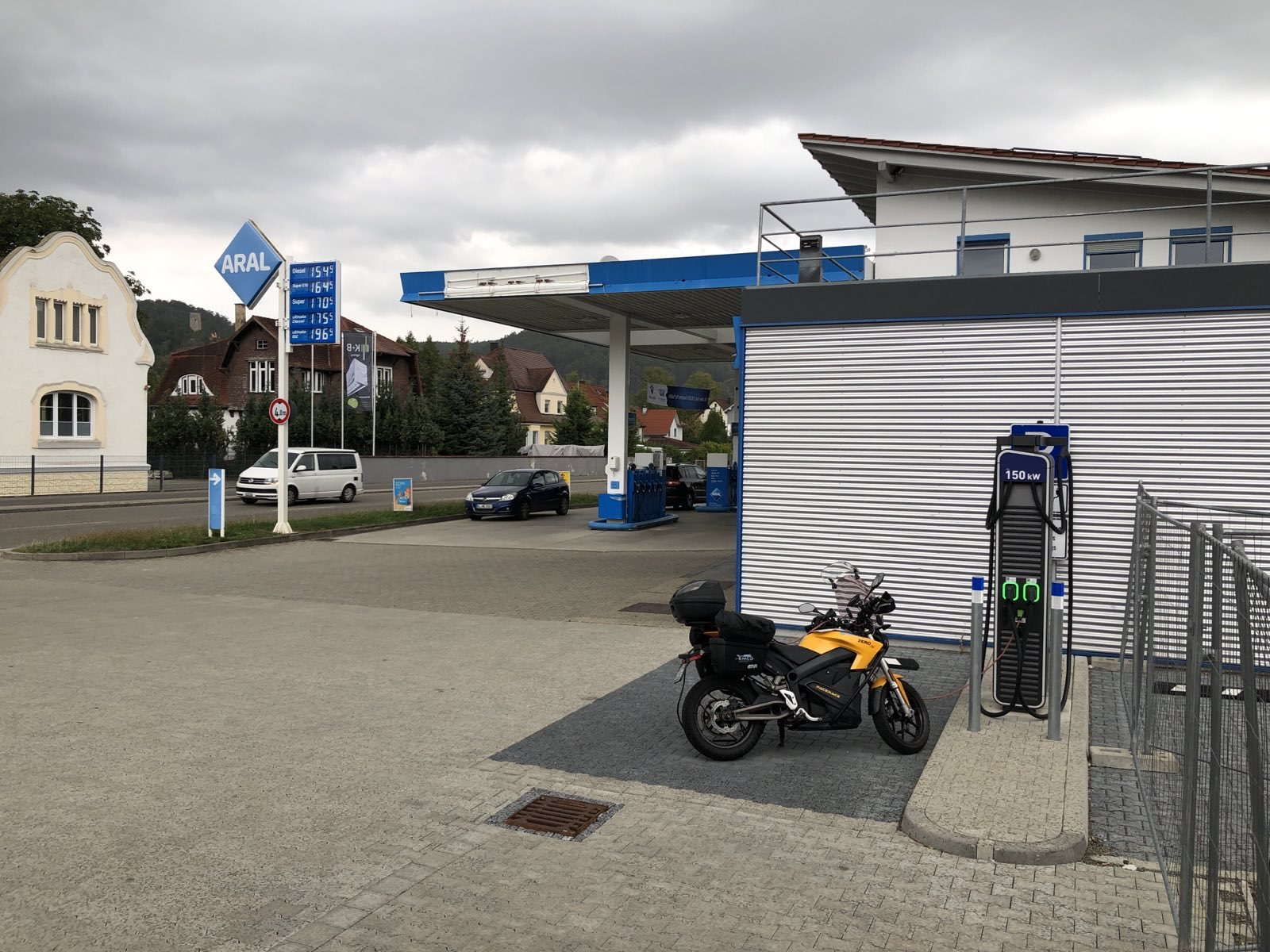 Schnell aufgebaut und die Seitenkoffer mit der Sitzbankabdeckung zugedeckt, denn der Regen hatte begonnen. Praktischerweise war direkt daneben das Schaumwerk Schelklingen, ein überdachter Autowaschpark, unter dessen Dach ich Zuflucht fand. Wo ich in Ruhe das Regenzeugs anziehen konnte, im Trockenen. Derweil die Zero nebenan auf 70% lud, was mir nach Hause die Schwäbische Alb runter genügen würde: Der Regen ließ dann auch wieder ETWAS nach, so dass es gegen 16:30 Uhr auf den letzten Stint Richtung Heimat gehen konnte, der schlicht sehr feucht war, aber ohne weitere abenteuerliche Geschehnisse.