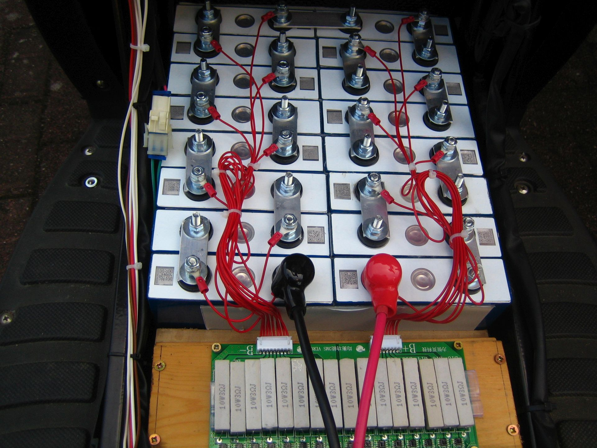 Ein Roller der gefahren wird, muß auch wieder geladen werden. Ich hatte noch ein 16-fach LiFePo4 Lastmodul, welches ich nunmehr montiert habe. Jede Akkuzelle hat ein Siegel mit Seriennummer - auf dieser Seite ist Plus. Die Ansprechschwelle beträgt 16 * 3,6V = 57,6. Die maximale Ladespanung sollte 0,8..1,6V niedriger sein.