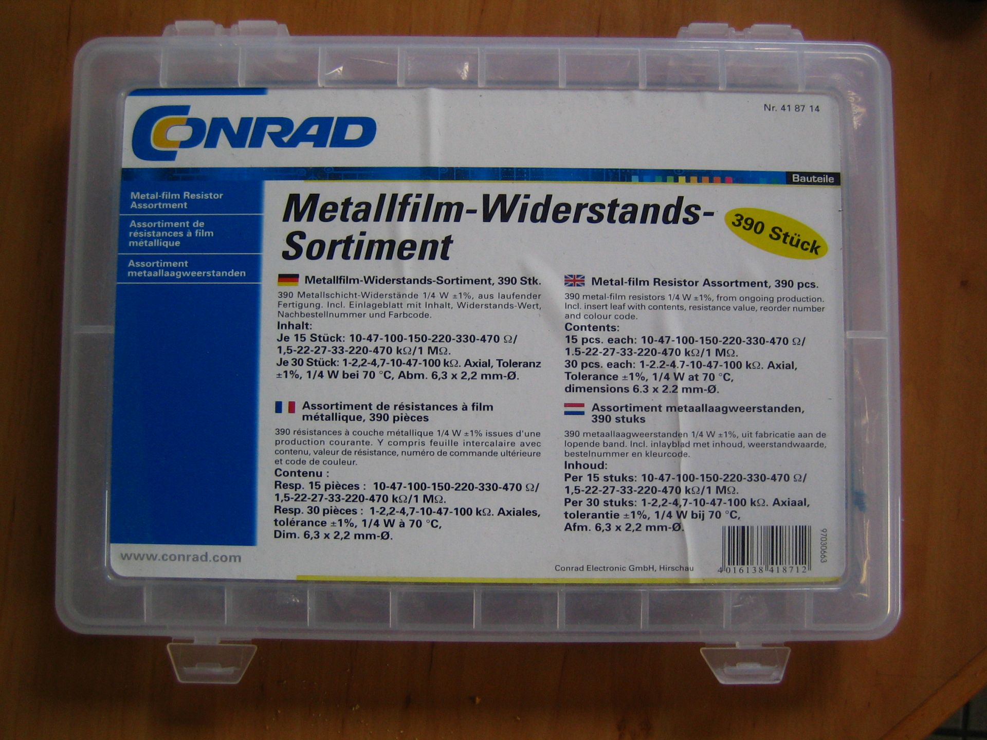 Datenblatt KTY84-130 bei 130°Cel. = 1.194 Ohm. KTY83-122 bei 130°Cel. 2.012 Ohm. Die Differenz beträgt 818 Ohm. Ich werde also einen ~ 820 Ohm Widerstand in Reihe mit dem Motortemperaturfühler legen. Dabei wird mir dieser Sortimentskasten helfen