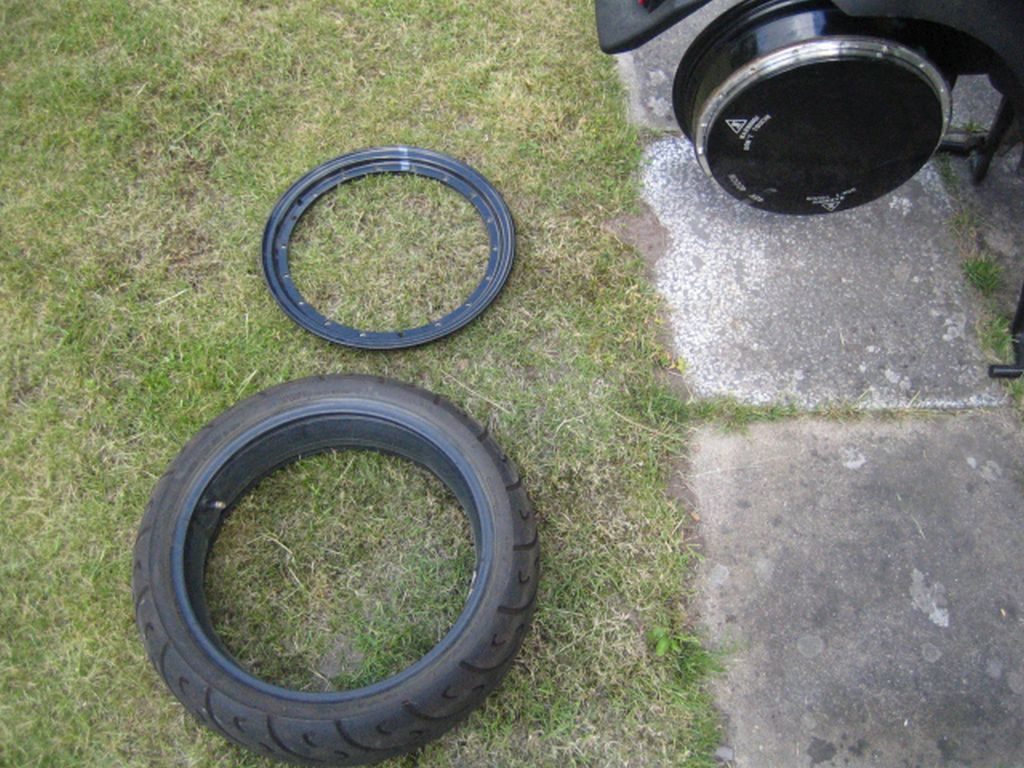 Hier noch ein älteres Foto einer Reifenreparatur von vor ca. 5 Jahren. Mit einem Originalschlauch ist es relariv leicht zu händeln. Die 3 tiefer liegenen Schrauben - der Felgenring geht da drüber - übrigens nicht lösen.