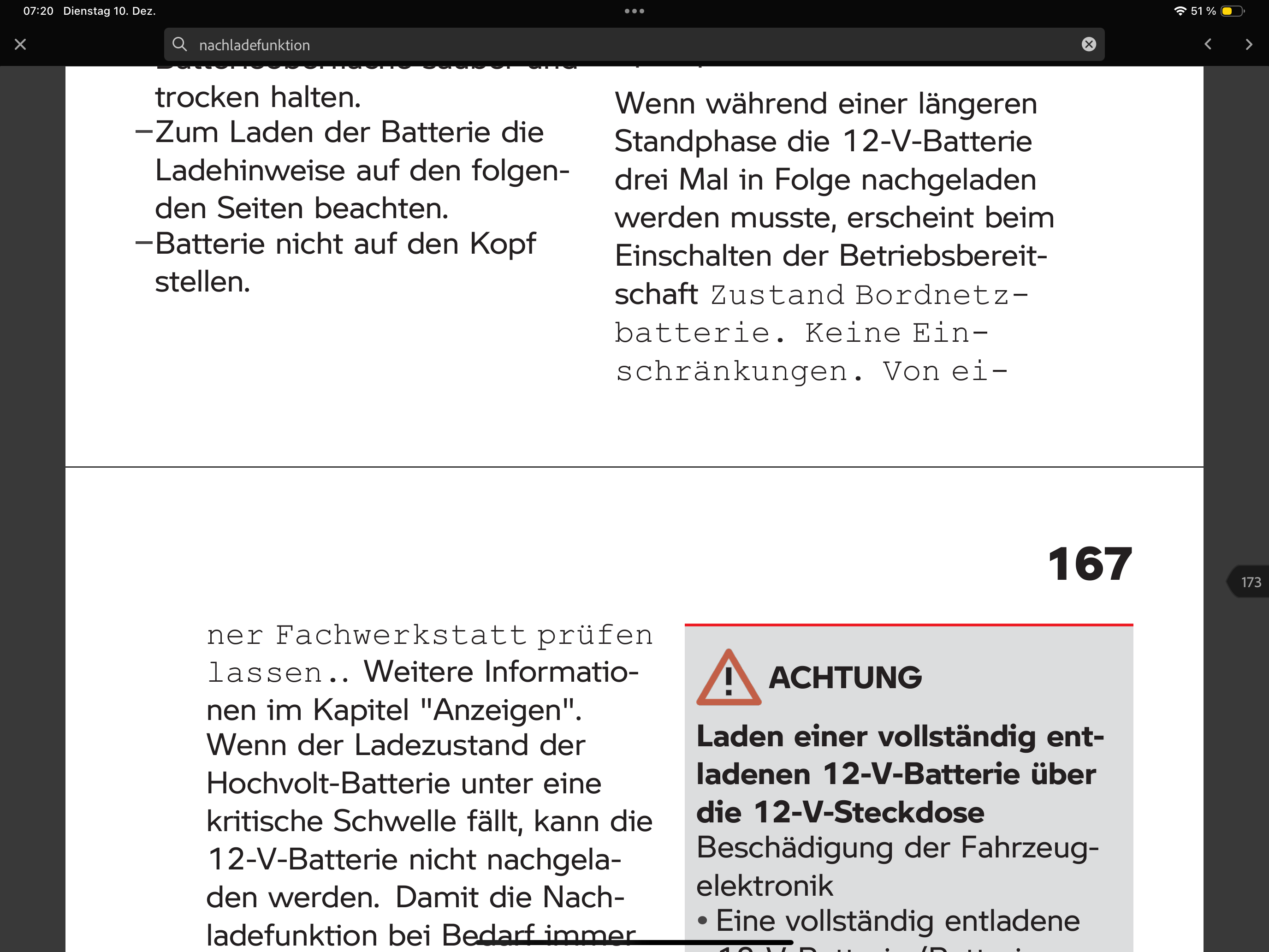 Wobei die extrem kurzen Aufladezeiten entweder für eine wirklich platte Batterie oder einen wirklich hohen Ladestrom sprechen. Letzteres wäre eine sehr plausible Erklärung für einen frühen Batterietod. Wenn BMW da Ladetechnik aus dem Verbrennerbereich genommen hat und viele A in die kleine AgM schiebt, weil ja normalerweise der Anlasser nachher wieder gehen muss - dann wäre das kein Wunder.