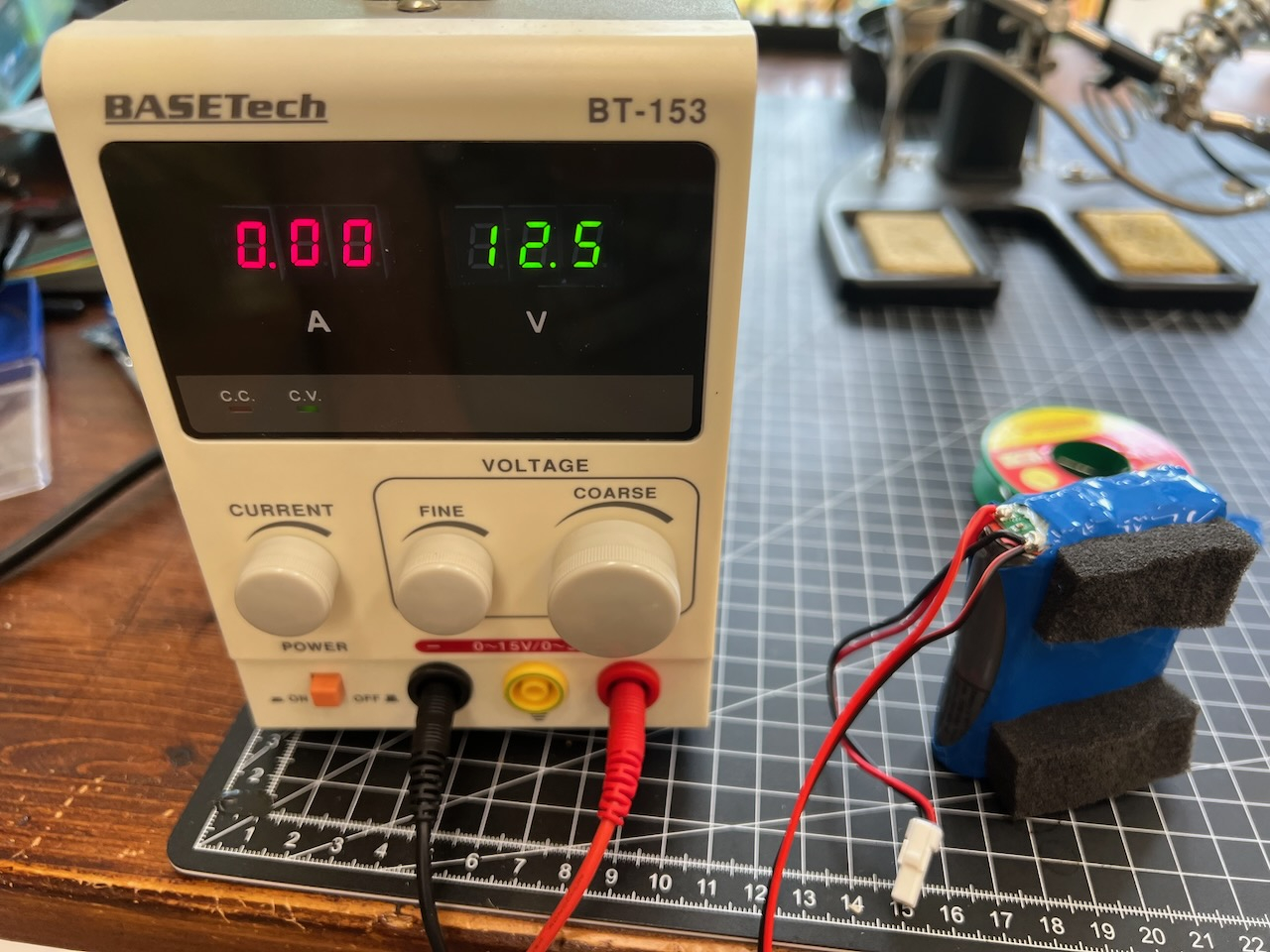 Ich kann jetzt entweder den Akku-Pack zerlegen und die Zellen einzeln in einer meiner zahlreichen Li-Akku-Ladegeräte laden. Dann sehe ich auch, ob die drei noch in Ordnung sind, bekommen sie dann in Ermangelung von Shrinkwrap und Punkschweißgerät aber nicht wieder zusammen