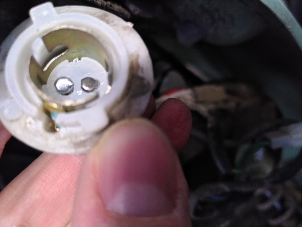 Hier die Rücklicht-Birne: 2 Kontakte und unten einer der beiden äußeren Pins, der sich genau mittig zwischen den Kontakten befindet.